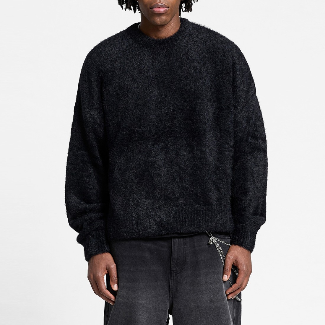 Essential Furry Knit Pullover aus cremefarbenem italienischem Garn, weich und warm, mit exklusiver Pelztextur. Der übergroße, kastenförmige Schnitt garantiert Komfort und Stil, aufgewertet durch ein raffiniertes Metallic-Detail und ein originelles Label. Perfekt für den Alltag oder besondere Anlässe. Hergestellt aus 100 % hochwertigem Polyacryl.