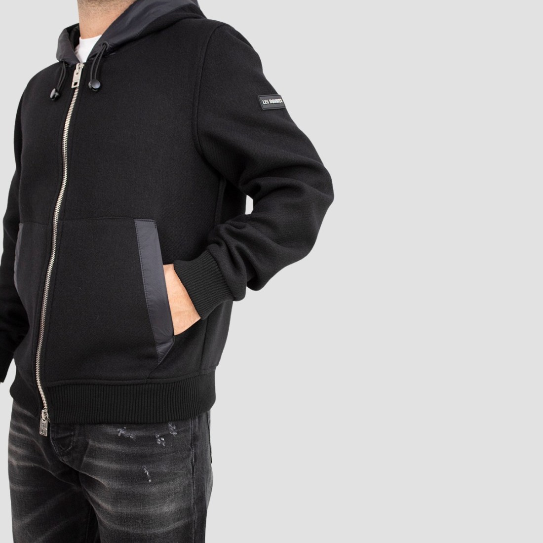 LES HOMMES - Schwarze, eng anliegende Jacke aus Wolle und Polyamid mit schwarzen Stoffdetails und aufgenähtem Logo-Patch am linken Ärmel. Kapuze mit elastischem Kordelzug innen, Seitentaschen ohne Verschluss und durchgehender Reißverschluss im Hauptteil. Innenfutter aus Polyester. Normale Passform und traditionelle Länge.Unser Kundenservice steht Ihnen von Montag bis Samstag von 10:00 bis 19:30 Uhr zur Verfügung