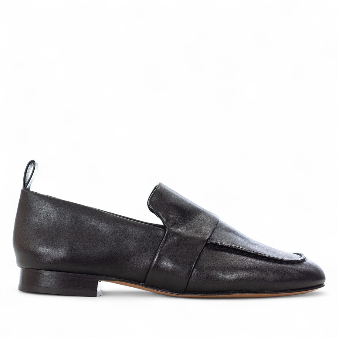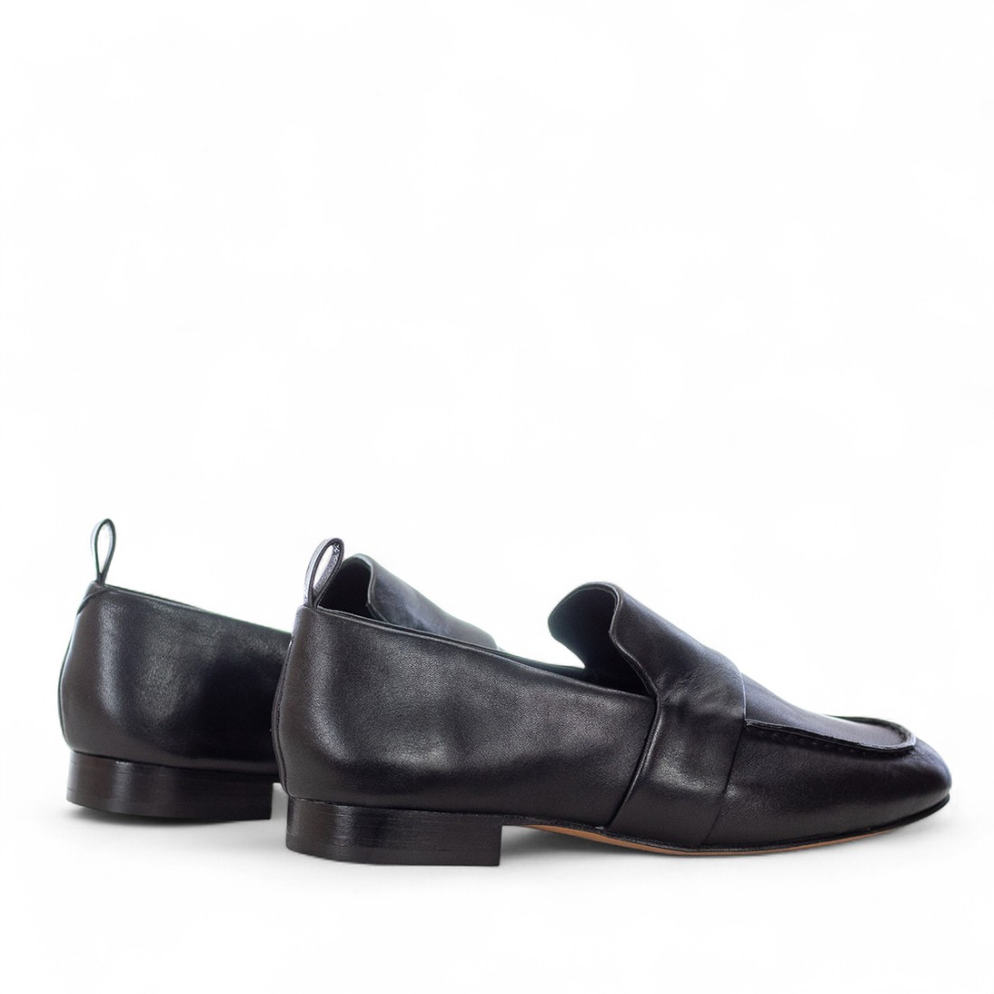 Weicher schwarzer Ledermokassin mit 20 mm Absatz. Das Lederfutter und die Innensohle bieten Komfort und Atmungsaktivität, während die Gummisohle mit Ledereinsatz Stabilität garantiert. Elegant und vielseitig, ist er perfekt, um einen schicken Look für jede Gelegenheit zu vervollständigen.