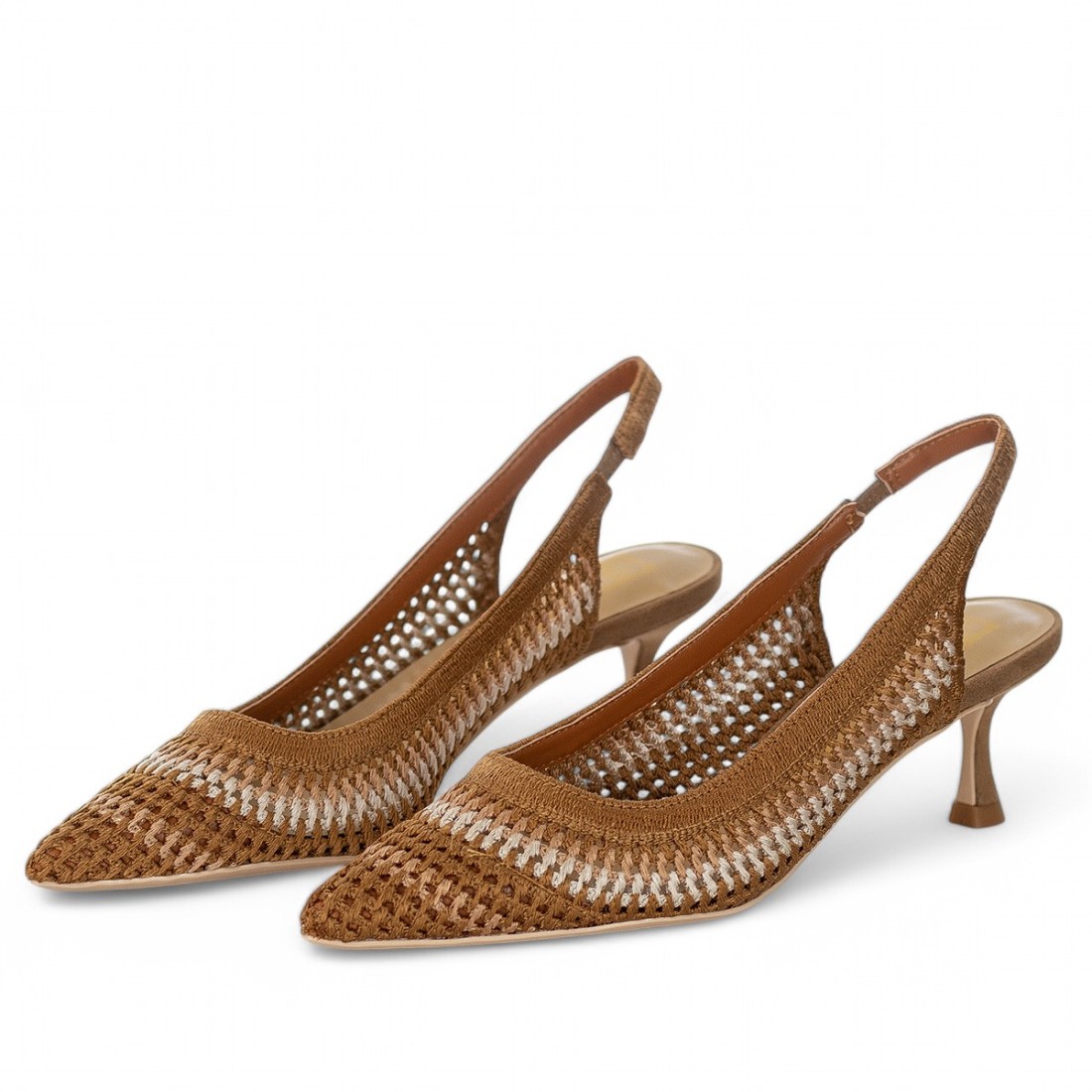 CHICONIC - Brauner Slingback aus echtem Webstoff mit elastischem Riemen, Gummisohle und 60mm Absatz. Perfekt für einen lässigen und doch raffinierten Look.