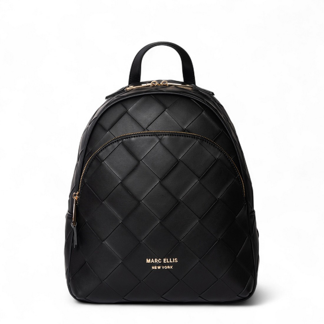 Rucksack Marc Ellis aus schwarzem Kunstleder mit elegantem gewebtem Print und Metalllogo auf der Vorderseite. Ausgestattet mit verstellbaren Trägern für optimalen Komfort, bietet er ein geräumiges Hauptfach und eine praktische Fronttasche mit Reißverschluss. Maße 28x35x15 cm, perfekt, um Sie im Alltag stilvoll zu begleiten.