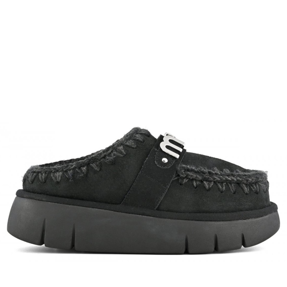 MOU Bounce Clog Metal Logo sabot in schwarzem Wildleder mit handgefertigten Häkelnähten. Der Innenraum ist mit weichem, doppelseitigem Schaffell für Wärme und Komfort gefüttert. Das Obermaterial ist mit dem MOU-Metall-Logo versehen und die Gummisohle sorgt für Stabilität und Haltbarkeit. Ideal für lässige und anspruchsvolle Looks zu jeder Jahreszeit.