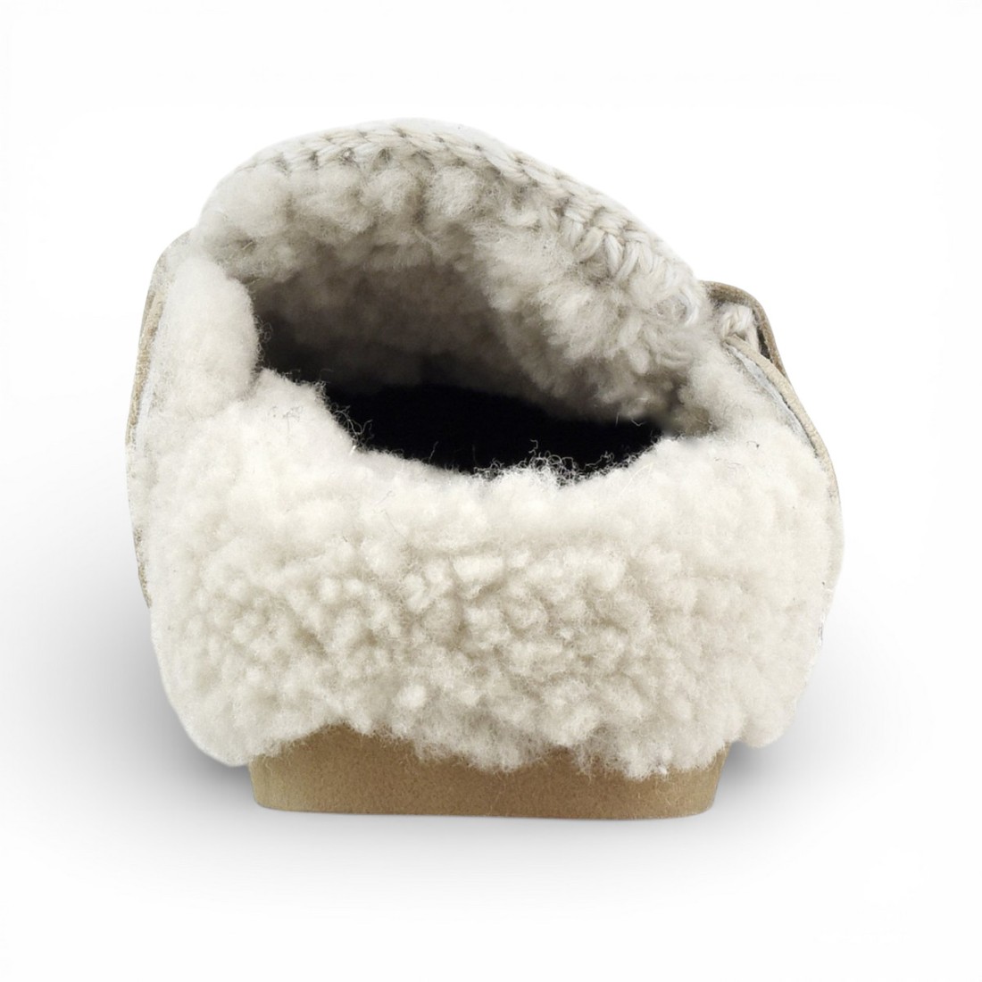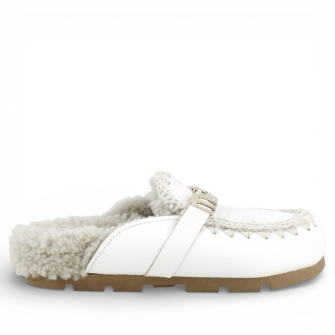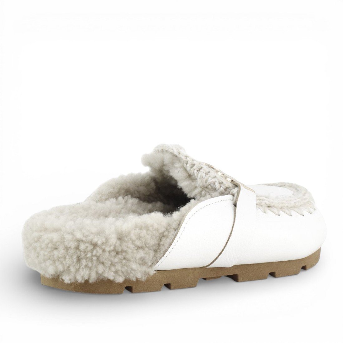 Ein weißer MOU-Sabot aus Leder mit eleganten Häkelnähten und einem weichen Schaffellfutter für kuscheligen Komfort. Das metallene MOU-Logo auf dem Schaft ist ein unverwechselbares Detail. Strapazierfähige Gummisohle, ideal für den täglichen Gebrauch mit Stil und Zweckmäßigkeit.