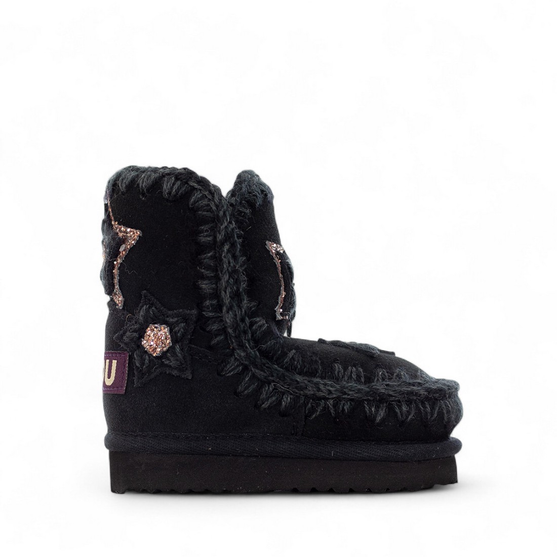 MOU-Stiefelette für Mädchen aus schwarzem Veloursleder mit Häkelnähten und Sternenstickerei mit funkelnden Strasssteinen. Das weiche, doppelseitige Schaffellfutter sorgt für Komfort und Wärme, während der Mou Logoaufnäher auf der Rückseite einen unverwechselbaren Akzent setzt. Strapazierfähige Gummisohle für einen eleganten und praktischen Look, ideal für kältere Tage.Unser Kundenservice steht Ihnen von Montag bis Samstag von 10:00 bis 19:30 Uhr zur Verfügung