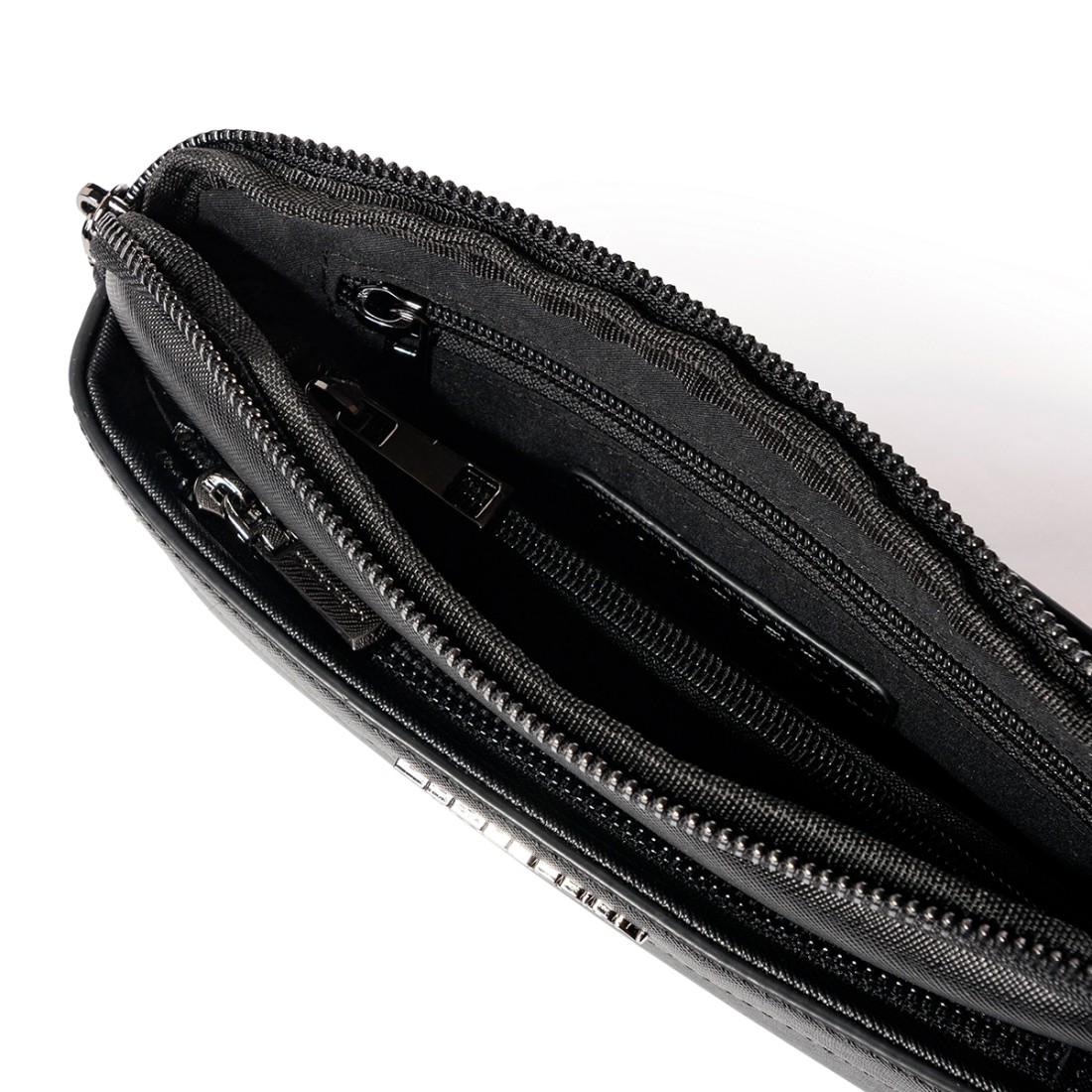 Elegante Clutch-Tasche aus Saffiano-Leder, praktisch und kompakt, mit Reißverschluss. Ausgestattet mit einer doppelten Außentasche und Innentaschen mit Reißverschluss, perfekt, um kleine Dinge stilvoll zu organisieren. Maße 24 x 14 x 4 cm.