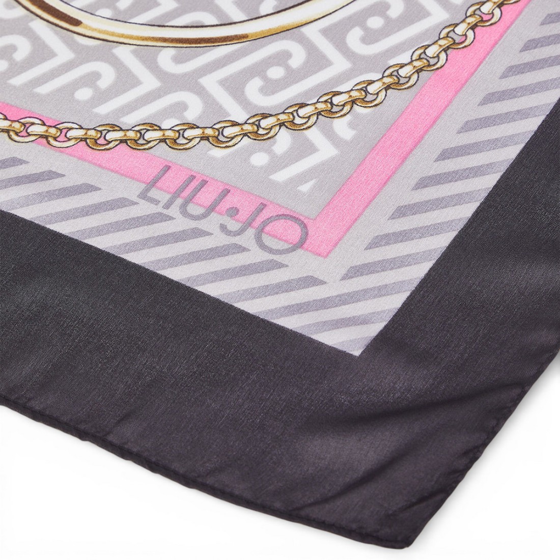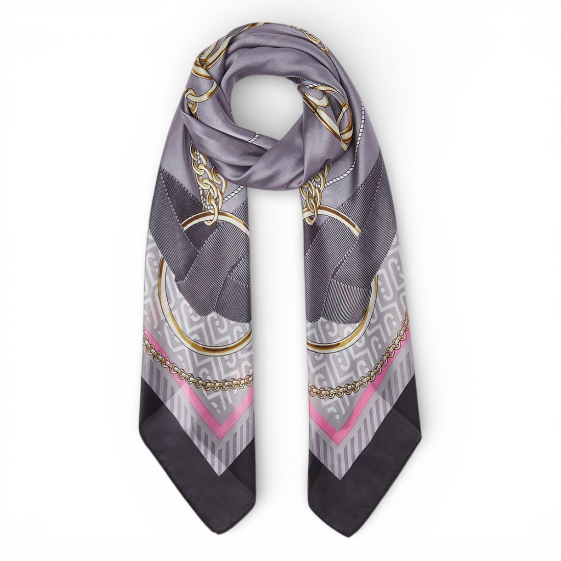 Square 120x120 cm scarf made of black recycled polyester yarn, lightweight and pleasant to the touch. The ribbon print gives movement and character, making it a versatile accessory to complete any look. Perfect to wear around your neck, in your hair or tied to your bag, it adds a touch of style with extra attention to the choice of materials.Our customer service is available Monday through Saturday from 10:00 AM to 7:30 PM