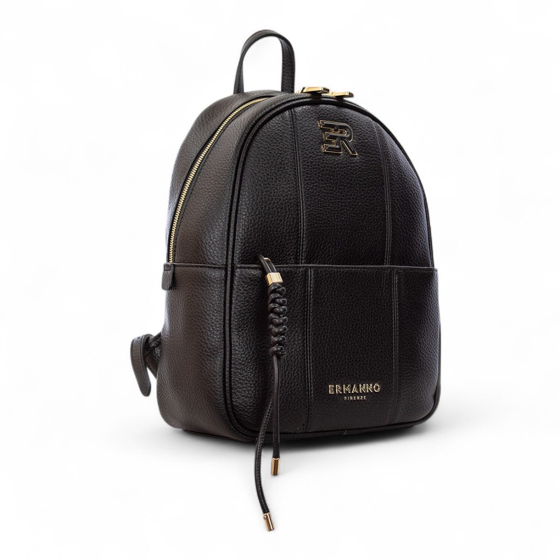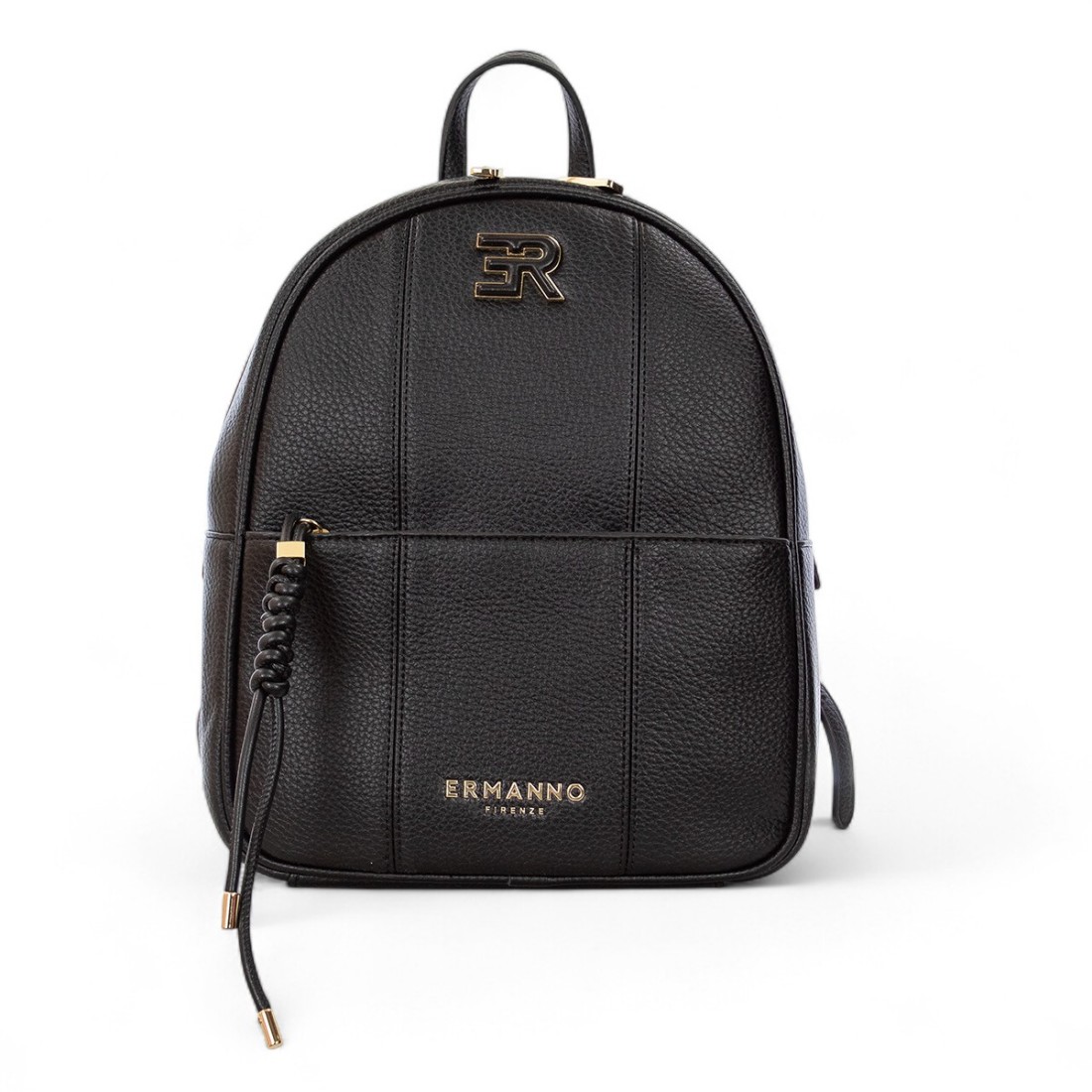 Violeta Ermanno Scervino backpack from the new Fall-Winter 2025-26 Collection, made of high-quality synthetic grained faux leather. The compact and feminine design is embellished with the front ER logo and golden writing Ermanno Firenze. It features adjustable shoulder straps, golden zipper closure and spacious interior with zipper pocket and multifunctional compartments. Measurements: 26 x 32 x 12 cm. Black color. Composition: 100% polyurethane, lining 100% polyester.Our customer service is available Monday through Saturday from 10:00 AM to 7:30 PM