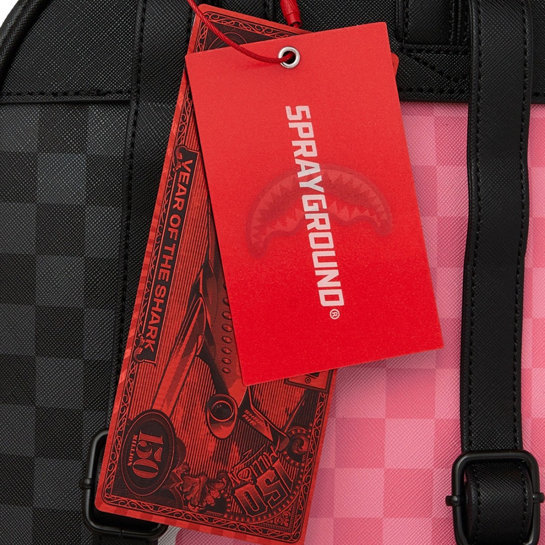Backpack Sprayground in pink PVC with "Pink and Black Tear Shark in Paris Savage" print and iconic logo on front. Gritty and functional design with adjustable fabric straps and breathable mesh for maximum comfort. Features key clip, side pouch pockets and convenient zipper closures. Dimensions: 25 x 30 x 13 cm.