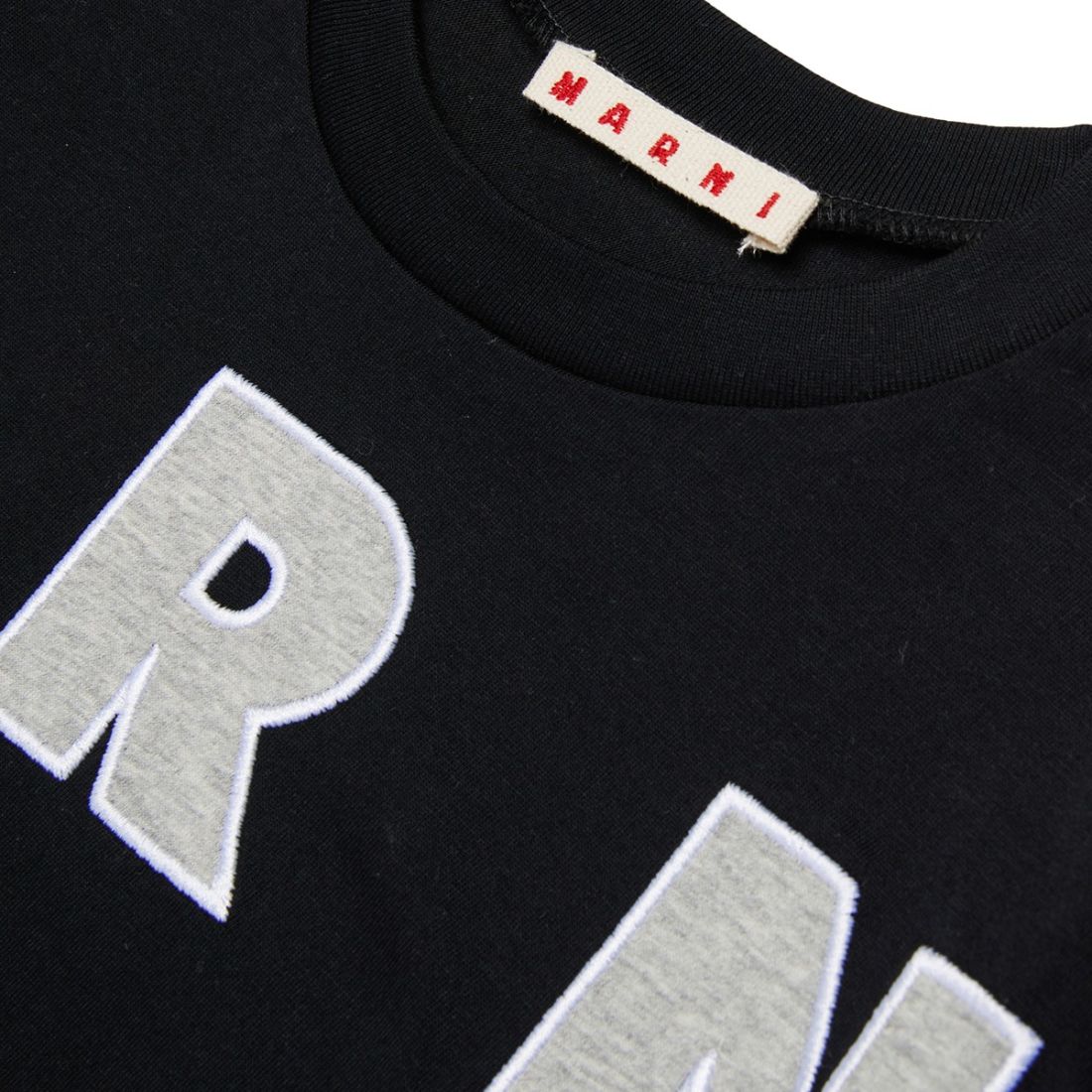 MARNI unisex crew-neck T-shirt for children made of soft 100% cotton jersey. The black model features a contrasting embroidered maxi lettering logo on the front, which also extends to the sleeves for a modern and recognizable look. Regular fit, ideal for everyday wear.
