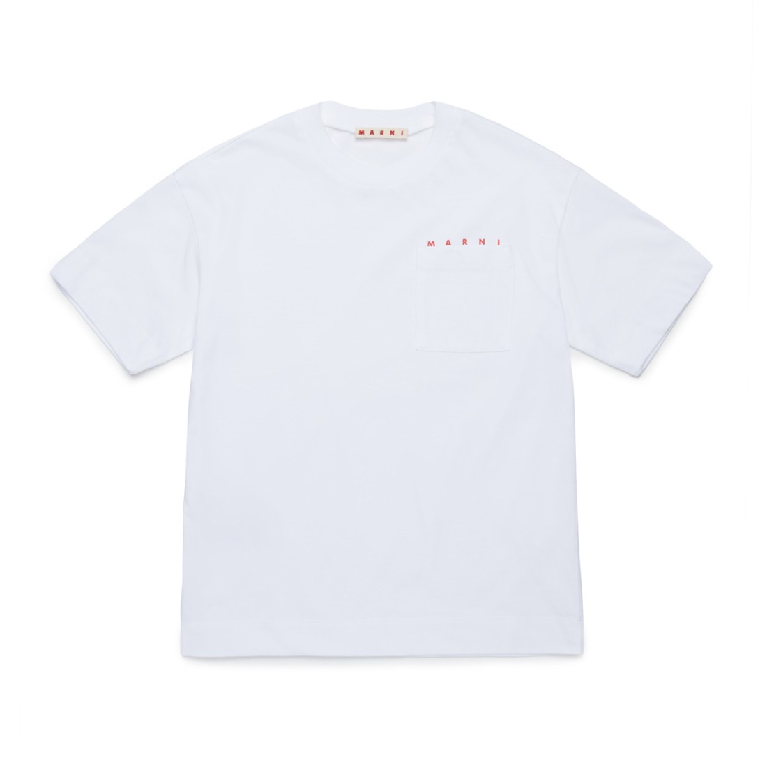 MARNI unisex children's T-shirt in white cotton jersey, an essential garment that combines comfort and style for everyday wear. The design features a crew neck, short sleeves and a handy chest pocket with heart detail. Contrasting lettering logo above the pocket adds a distinctive touch. Made of 100% cotton, regular fit*Item from the children's collection, also wearable by women.