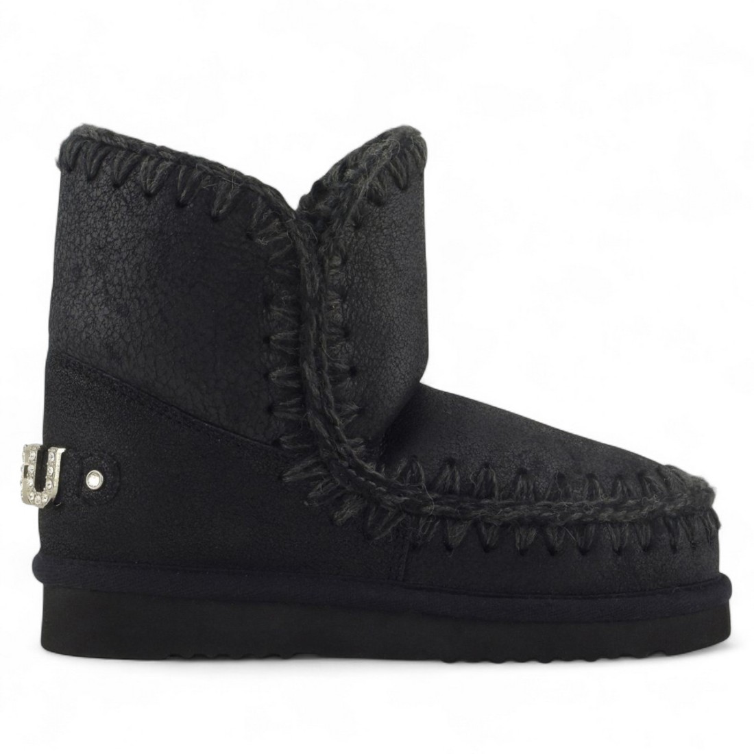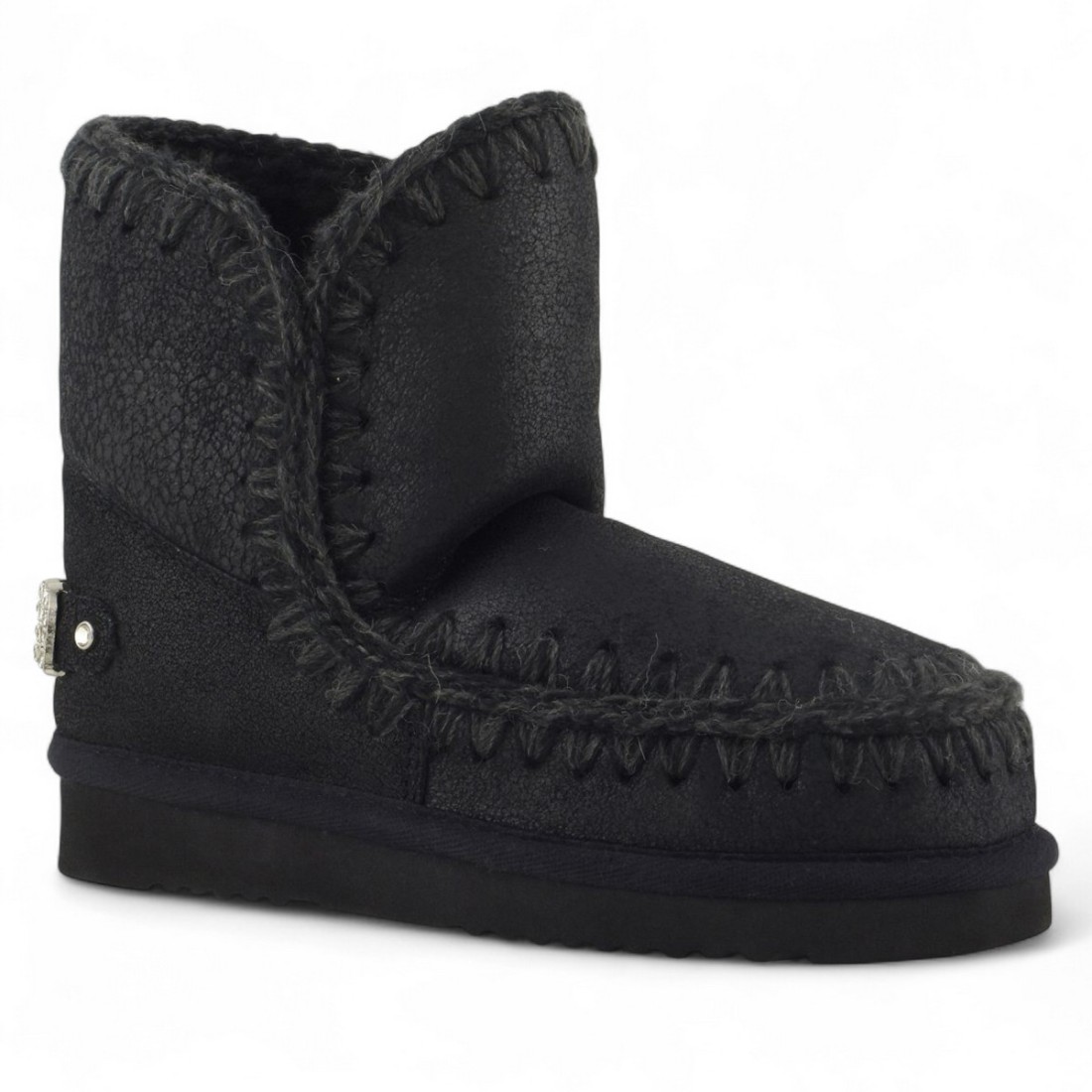 Discover the MOU Eskimo 18 Rhinestones Logo ankle boot in black cracked leather, finished with crochet stitching and rhinestone logo Mou on the back. The soft double-face sheepskin interior ensures comfort and warmth, while the rubber sole offers stability and durability. An authentic and distinctive style for every season.