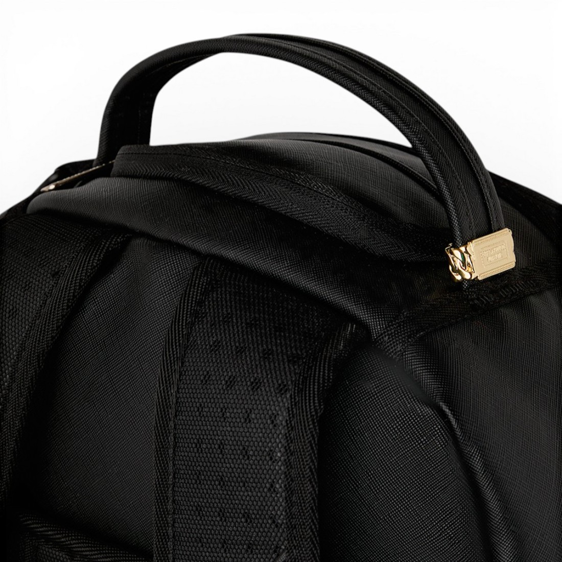 Backpack Sprayground in black pvc with "Missing Bag Flyer DLXSV" print and gold contrasting front logo. Features adjustable fabric shoulder straps with breathable mesh inserts and padded mesh back for comfort. Includes dedicated velour eyewear compartment, side pockets, padded interior laptop pocket. Zipper closure. Dimensions 46 x 29 x 15 cm.