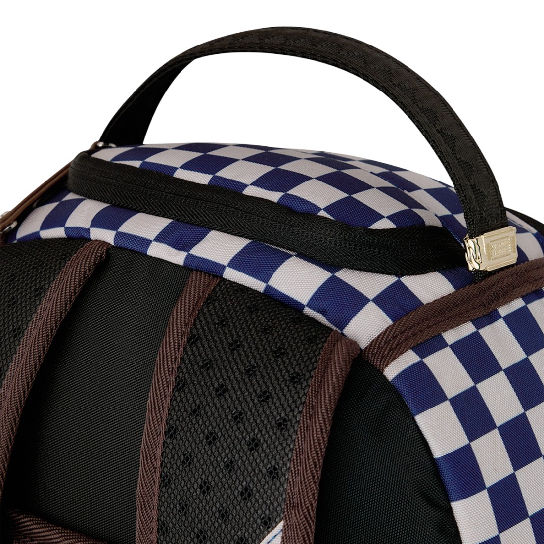 Backpack Sprayground in blue and white checkered fabric with " Ichimatsu-Moyo Camokawa" print and contrasting front logo. Features adjustable fabric shoulder straps with breathable mesh inserts and padded mesh back for optimal comfort. Includes dedicated velour goggle compartment, side pockets, padded interior laptop pocket and rubber "Sprayground Authentic" badge. Zipper closure. Dimensions 46 x 29 x 15 cm.