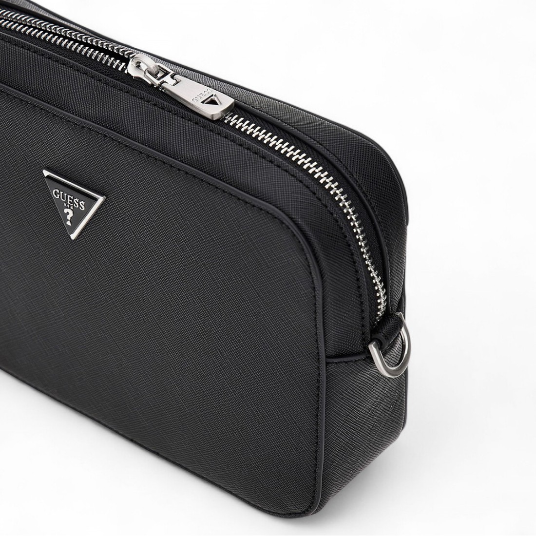 Stylish bag Guess for small items, made of high-quality synthetic material. Featuring a zippered closure, it has two practical interior pockets, one open and one zippered. The handle is detachable, while the adjustable and removable strap offers comfort and versatility. Does not fit A4 size. Dimensions: 22 cm (width) x 14 cm (height) x 6 cm (depth).