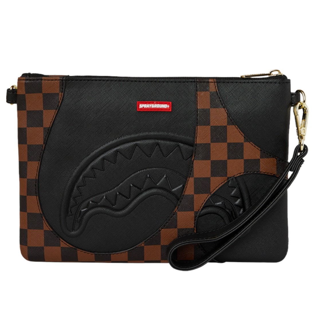 Clutch bag Sprayground Sharkpology Brown Crossbody: street-chic style with brown and black check print and embossed shark details. Adjustable shoulder strap and wrist strap for maximum versatility. Compact, durable and iconic design. Perfect for original urban looks with a luxury touch.