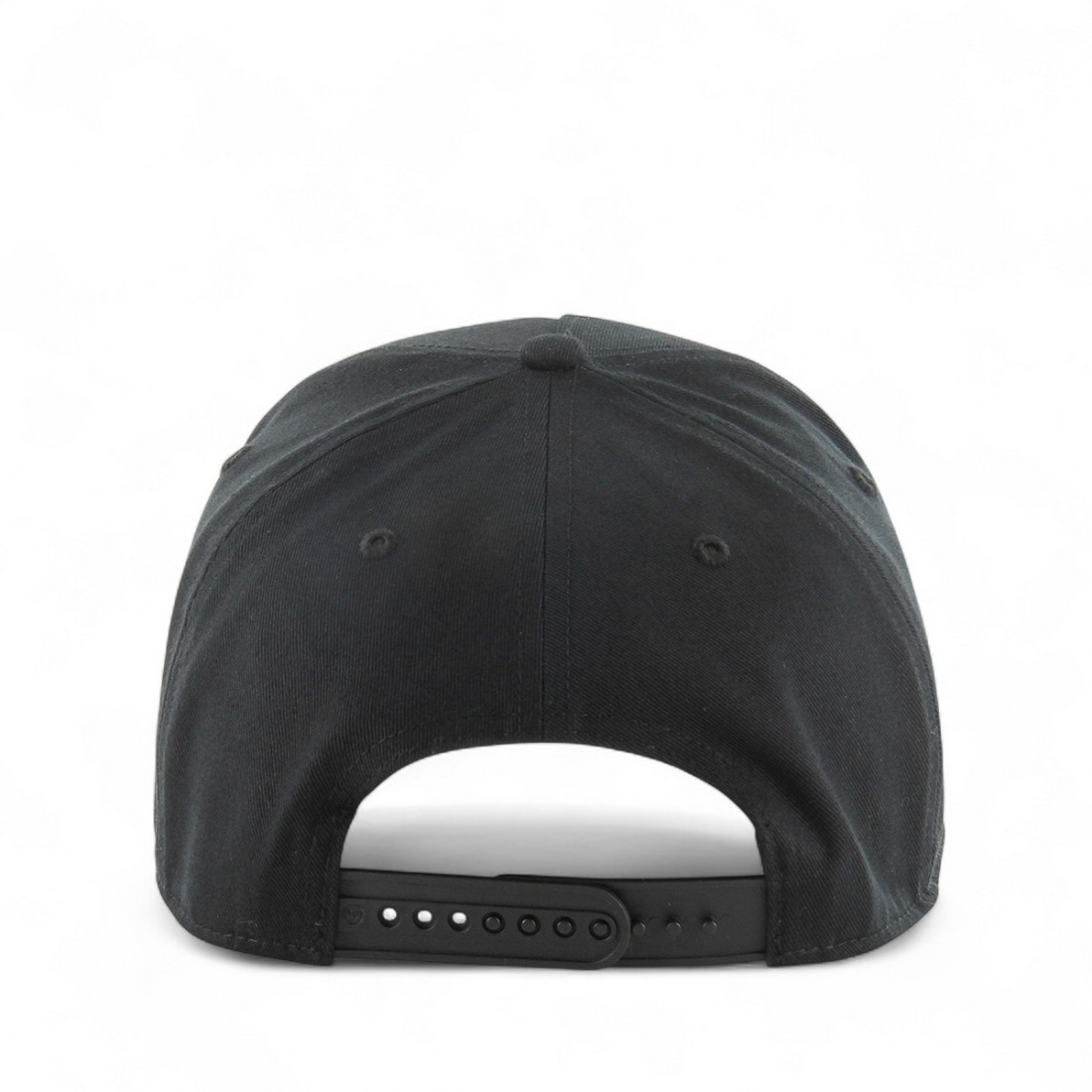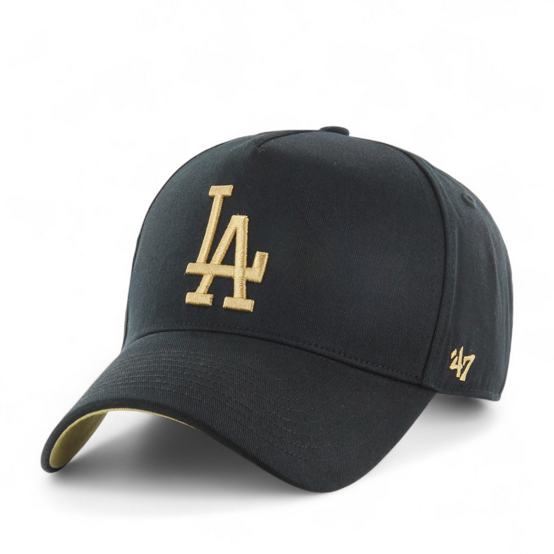 Black cotton '47 BRAND baseball cap with contrasting gold embroidered "Los Angeles Dodgers" logo and 1988 World Series patch on the side. Adjustable with plastic buckle, it combines sporty style and premium quality, ideal for completing any casual outfit with an authentic MLB fan touch.
