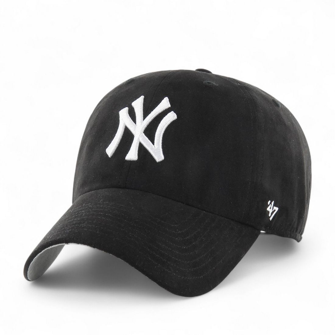 Baseball cap '47 Brand in black polyester with stylish suede finish. Features New York Yankees logo embroidered in white on the front and adjustable strap with gold electroplating on the back. Perfect for casual and sporty style, ideal for any season.Our customer service is available Monday through Saturday from 10:00 AM to 7:30 PM