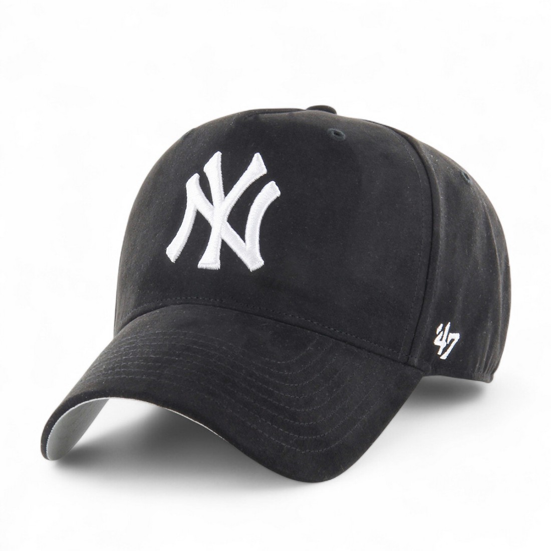 '47 BRAND - Black polyester baseball cap with suede effect, perfect for casual, sporty style. Embroidered "New York Yankees" logo in white on front and adjustable back closure with fabric buckle and snap button for a comfortable, customized fit every time.