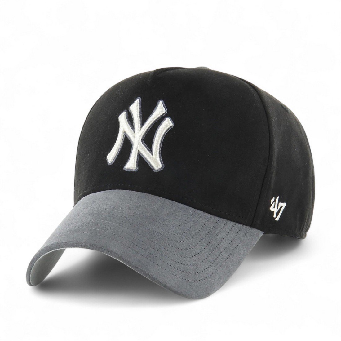 '47 BRAND - Black polyester baseball cap with stylish suede finish, contrasting embroidered "New York Yankees" logo on front, and adjustable fabric buckle with snap button on back. The gray pre-curved visor, also with suede effect, completes a sporty, modern look ideal for any season.Our customer service is available Monday through Saturday from 10:00 AM to 7:30 PM