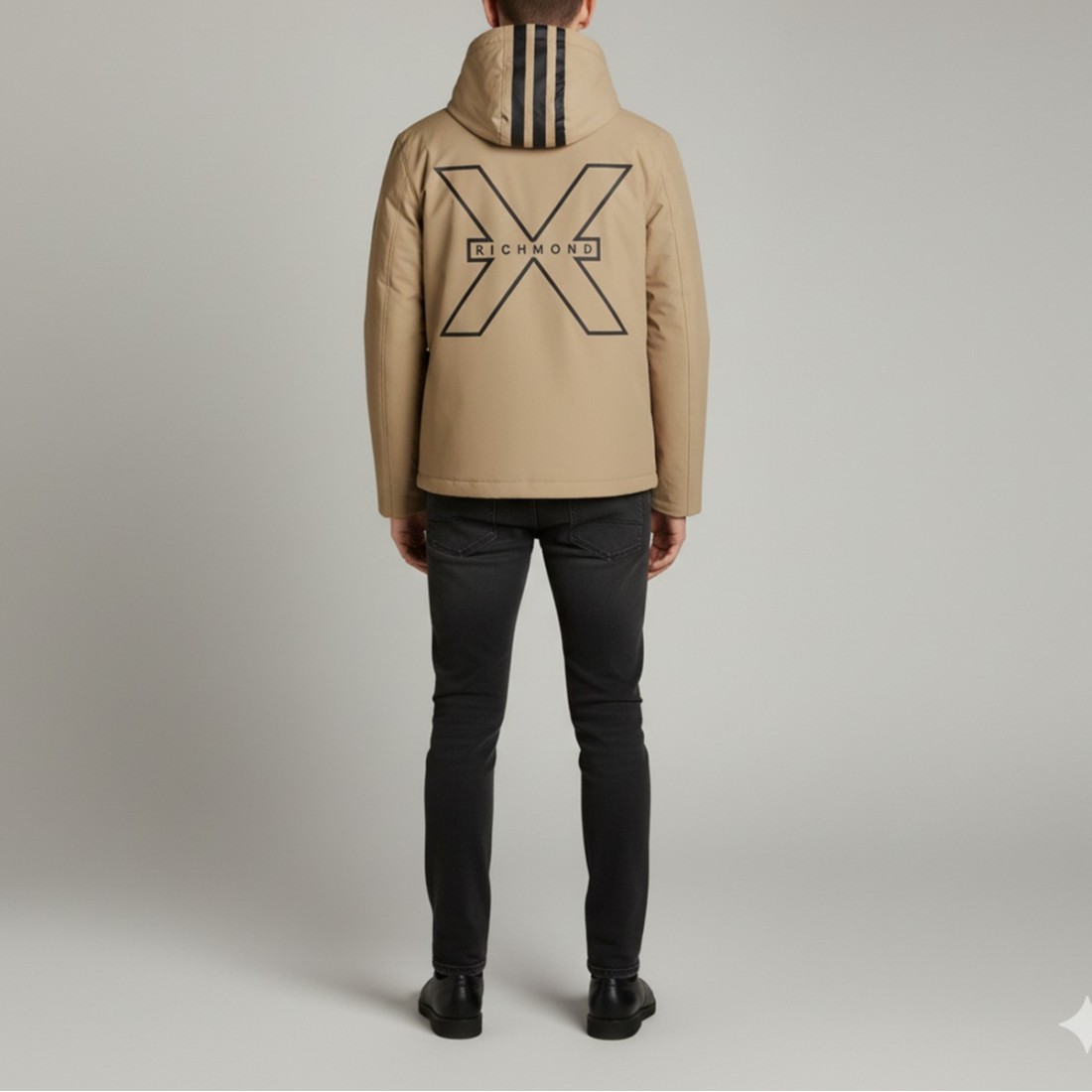 Richmond X reversible jacket in black or cream polyester, with lettering logo on chest or maxi logo on back. Features zipper closure, side pockets with snap buttons and adjustable drawstring waistband. Modern and comfortable style, perfect for those seeking a dynamic and versatile look for any occasion.