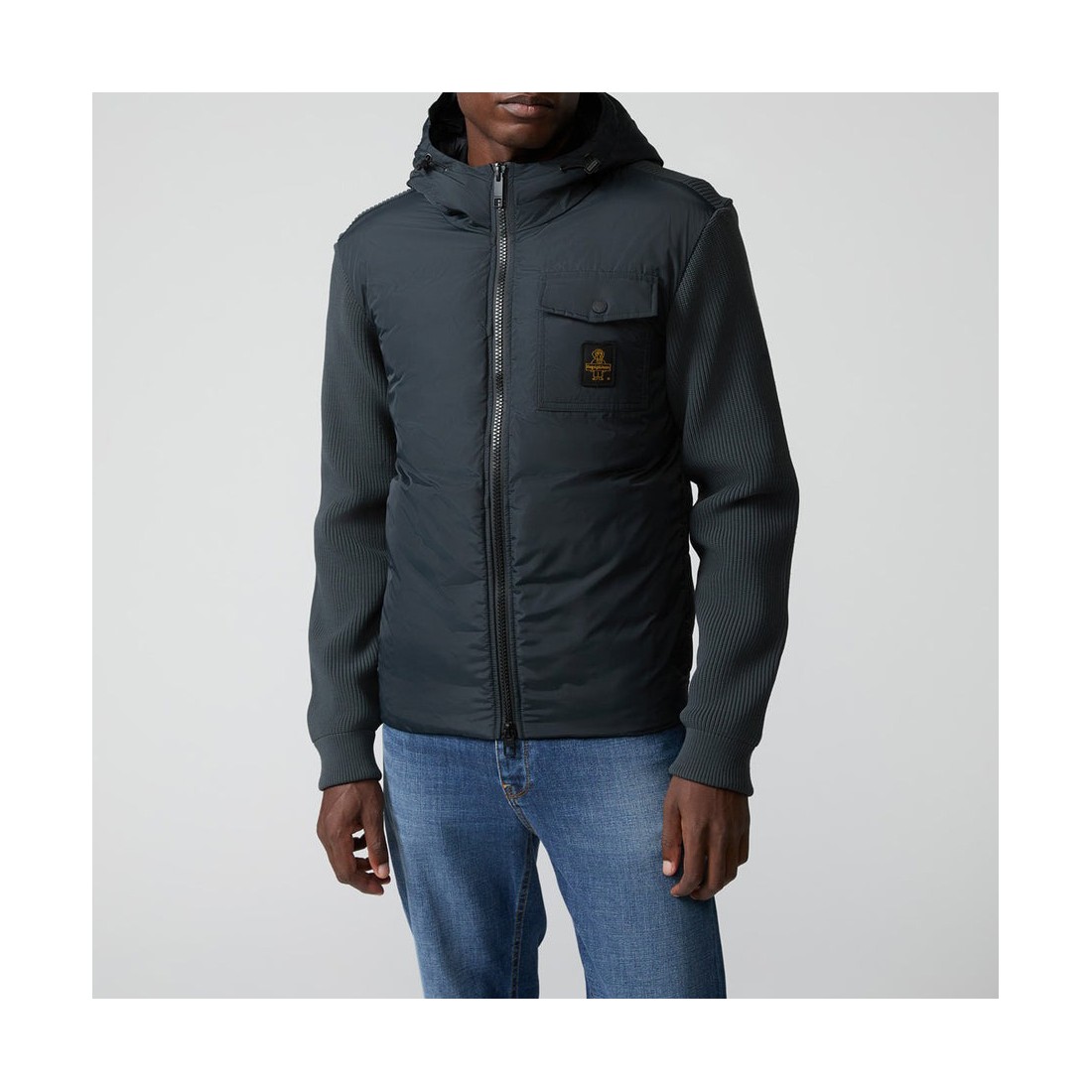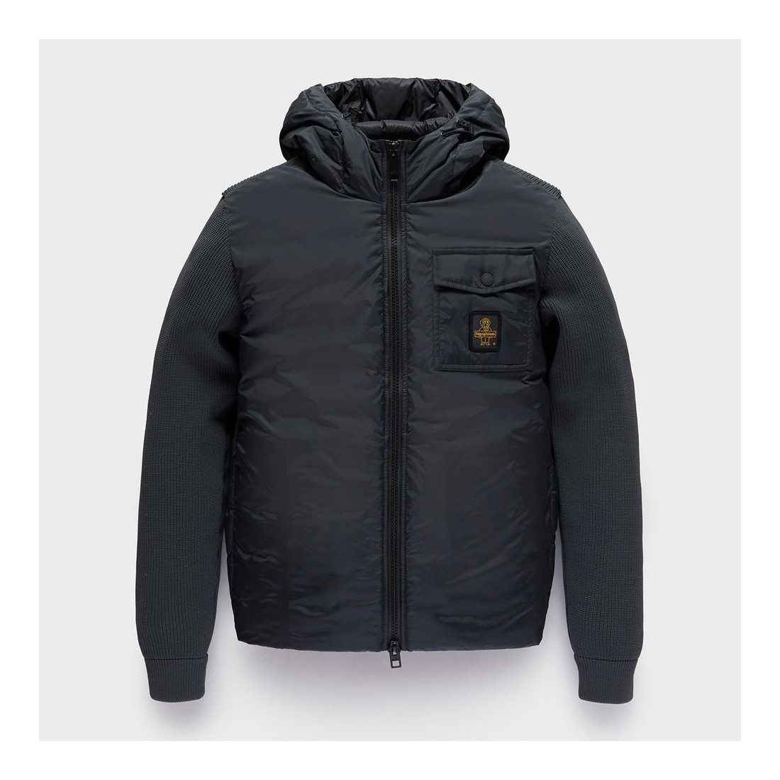 Hybrid winter down jacket with a modern and refined look. The front and hood, made of matte nylon with a soft, velvety texture, are filled with 90/10 RDS-certified down with a Reclosed® membrane that reduces feather shedding and ensures durability. Back and sleeves in super-technical knit ensure comfort, durability and fit. Water and Wind Resistant, with iconic breast pocket and RefrigiWear® logo patch.