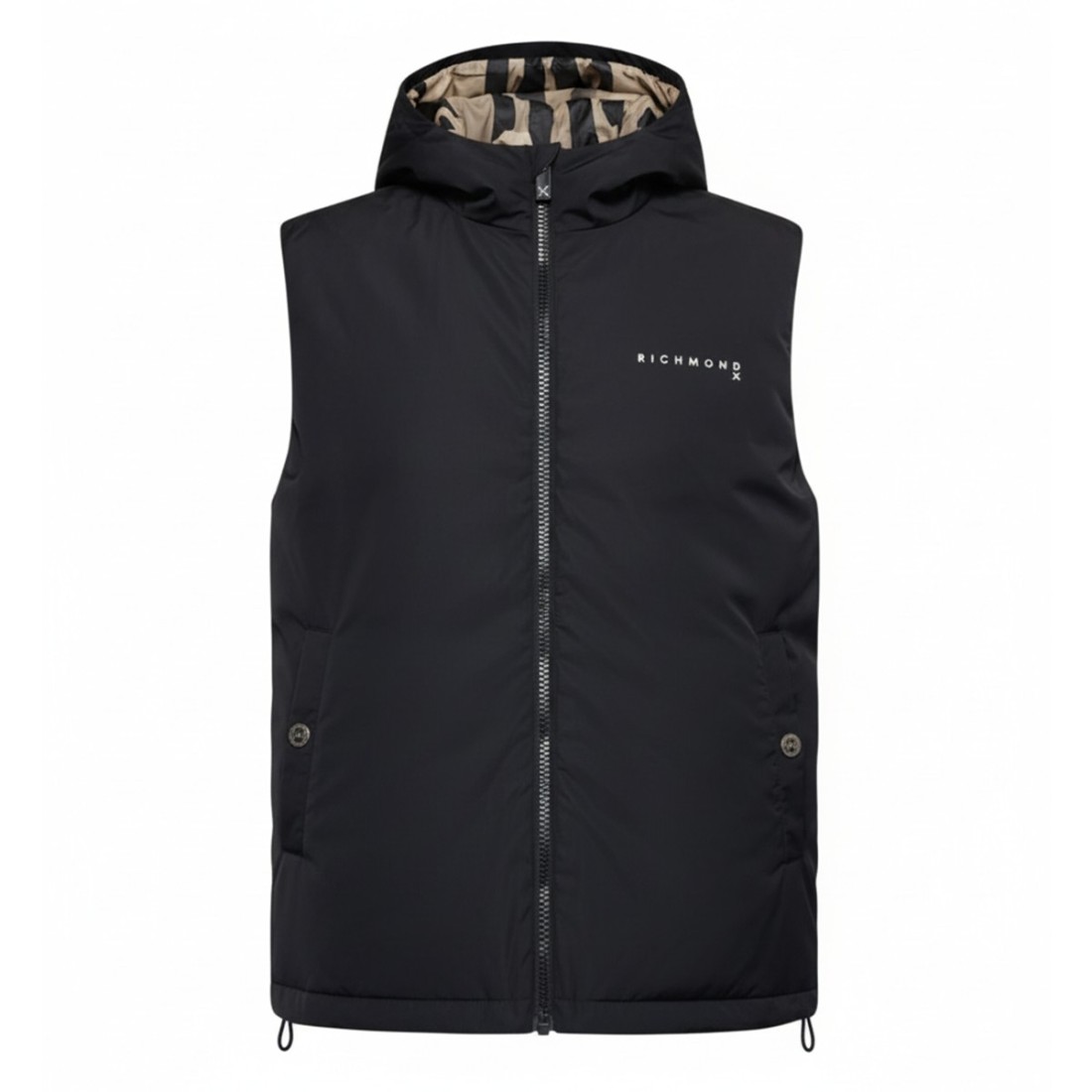 Richmond X reversible nylon vest, offered in black/cream variant. Features a printed hood, front zipper closure and side button pockets. Adjustable drawstring hem ensures a practical fit, while a printed logo on the chest and logo print on the back complete the design. Made of 100% polyester.