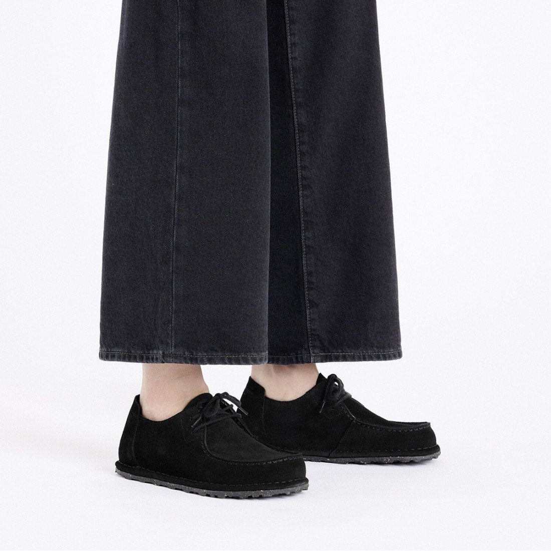 BIRKENSTOCK Utti is the lace-up shoe with timeless style and exceptional comfort. Made of soft black suede, it offers a removable Deep Blue anatomical footbed, microfiber insole and natural rubber sole with cork inserts. The decorative stitching and heel tab combine practicality and refined design.
