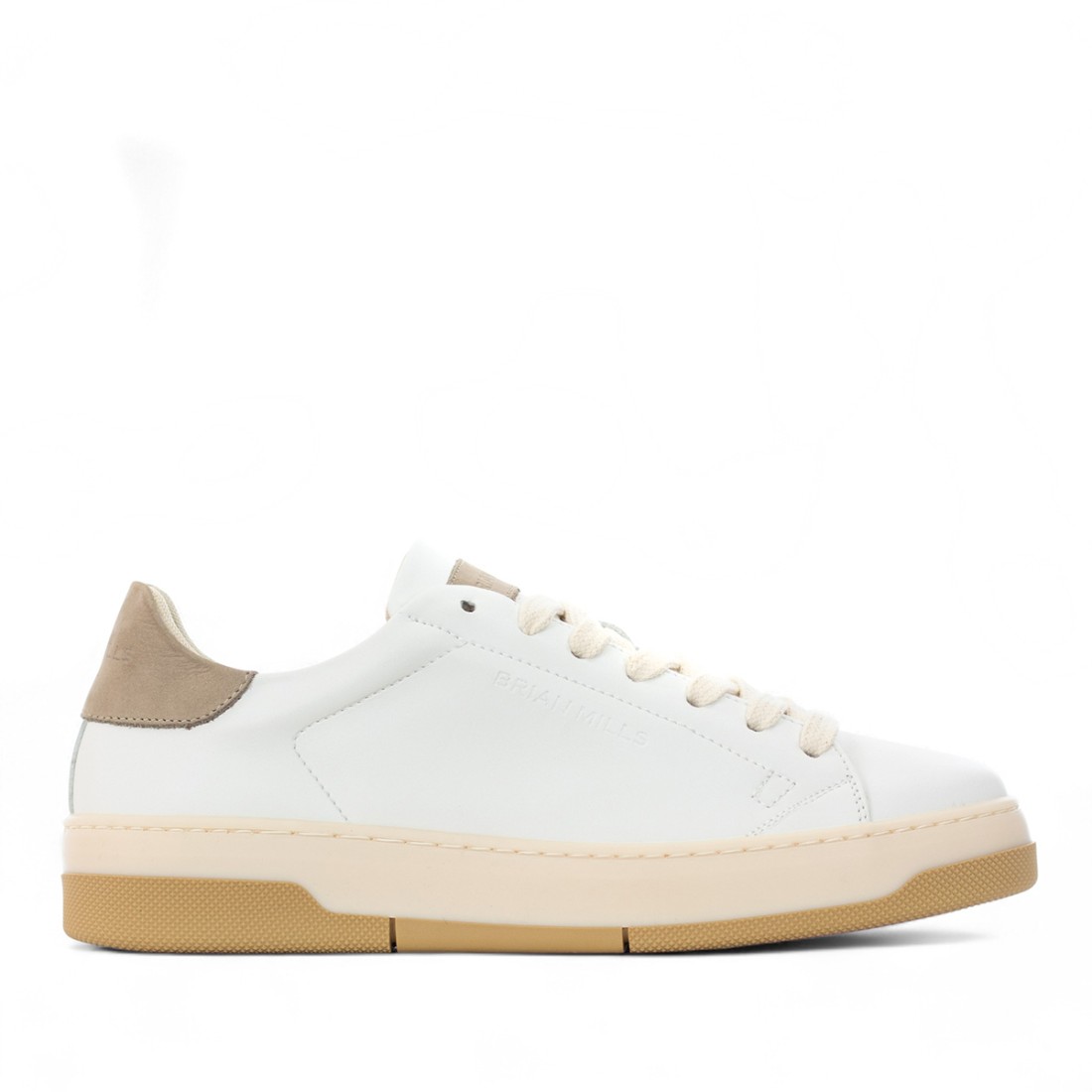 BRIAN MILLS men's white leather sneakers, enhanced with beige suede inserts on patch and tongue. Unique and fashionable design, perfect for a sophisticated look. Leather sole with rubber bottom and fabric lining for uncompromising comfort and style.Our customer service is available Monday through Saturday from 10:00 AM to 7:30 PM