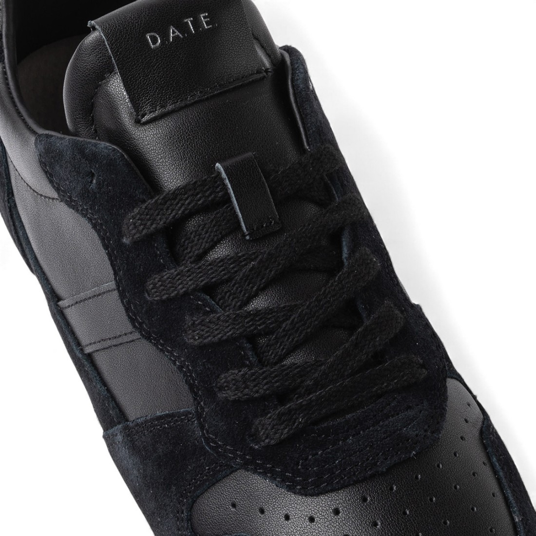 Sneakers D.A.T.E. Court 2.0 in black leather and suede, with a clean, versatile style. Perforated toe promotes breathability, while tongue reads D.A.T.E. Cotton laces, logo and code imprinted on side. Side band and back heel in black leather. Leather and cotton terry lined interior for everyday comfort.