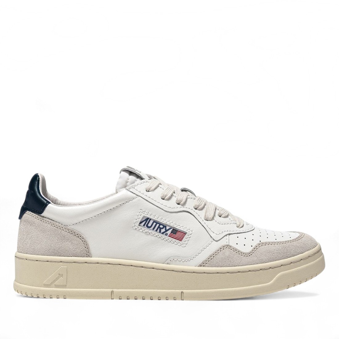 Medalist Autry sneakers, a contemporary reinterpretation of the iconic 1980s tennis style. Made of soft white leather with beige suede inserts, it combines comfort and character. Blue leather detail at the heel with Autry logo adds a distinctive touch. Leather and cotton terry lining, raised insole and rubber outsole ensure comfort and durability.