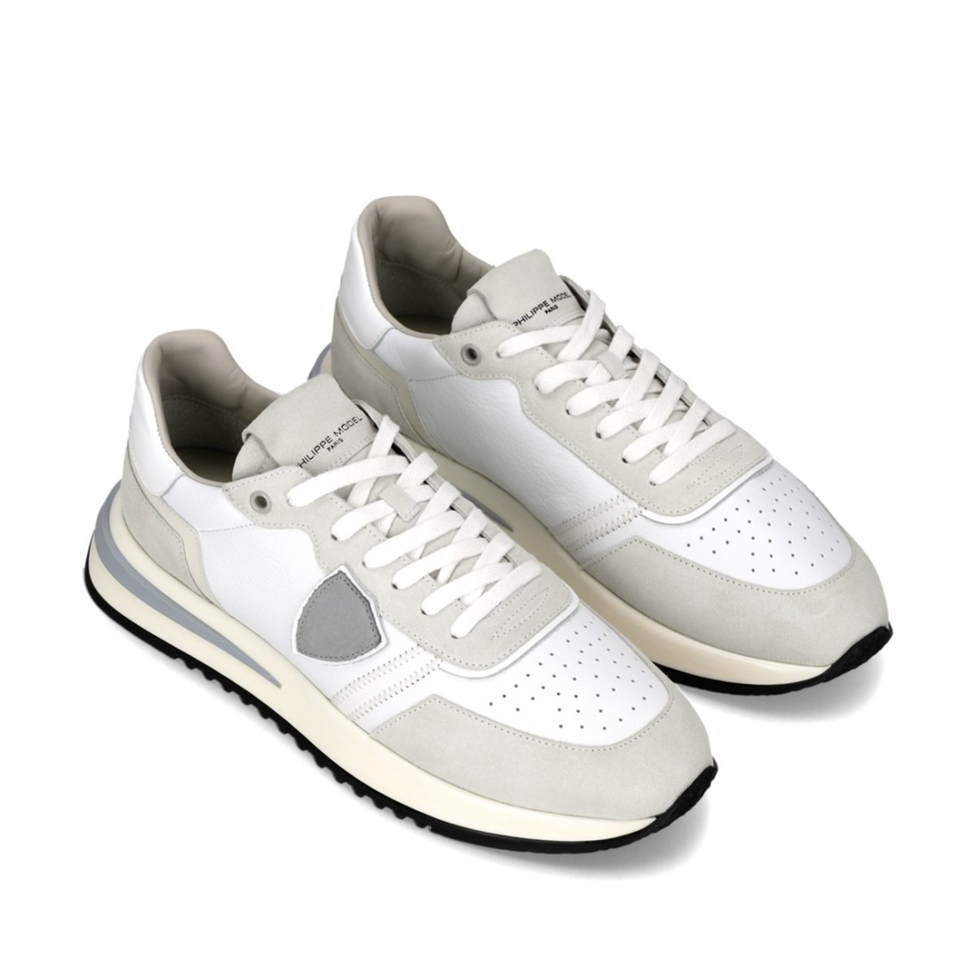 Inspired by the iconic 1970s running shoes, the Tropez 2.1 from Philippe Model combines vintage charm with contemporary lines. The Strobel construction, with a directly stitched upper and sole, ensures comfort, flexibility and a fit that adapts to the foot. The white leather is enhanced by contrasting gray suede inserts, while the rubber sole with three-dimensional detailing completes the design with a distinctive touch.
