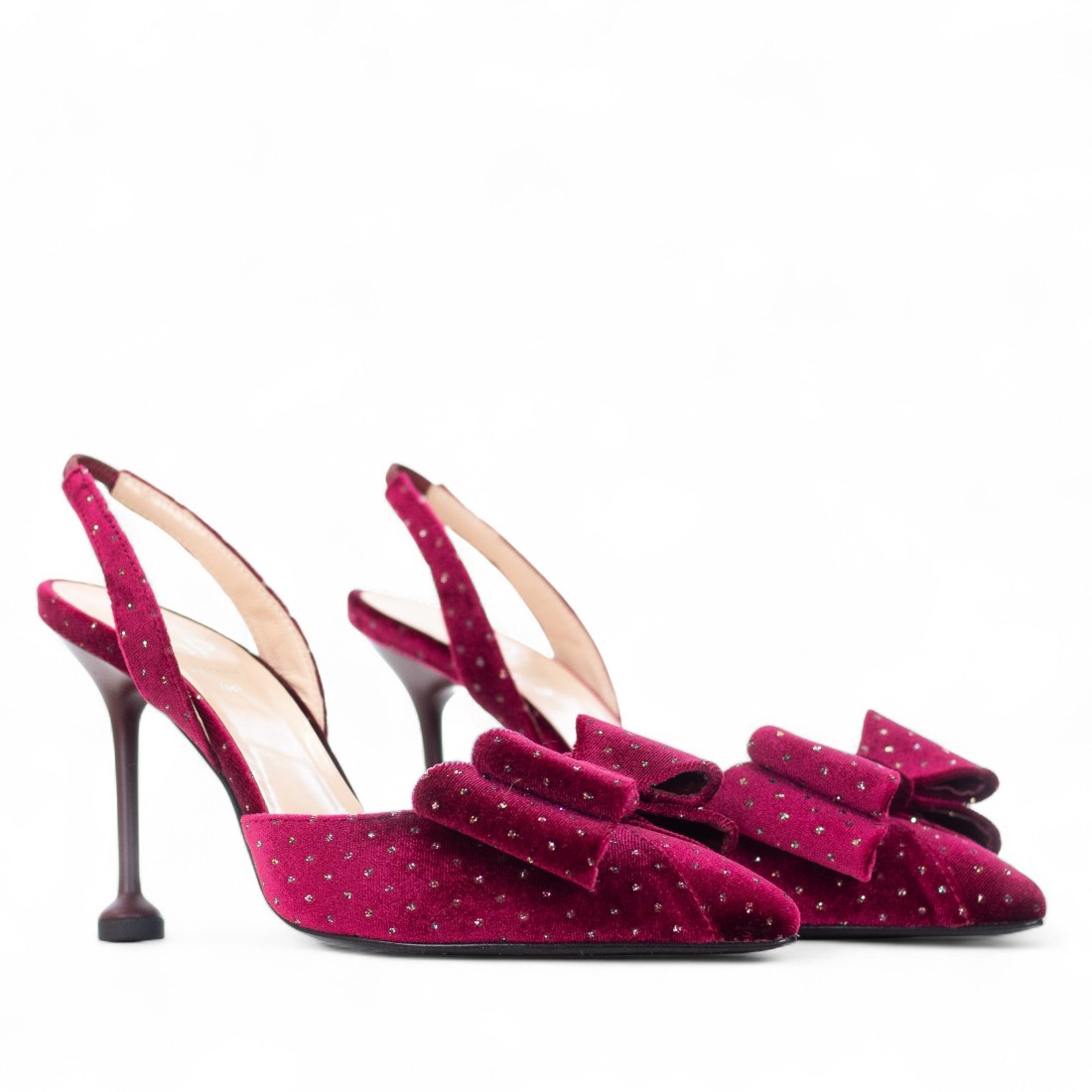 Decolleté G.P. Bologna in elegant burgundy velvet, perfect for adding an original and sophisticated touch to your look. The approximately 10 cm heel slims the figure, while multicolored glitter polka dots give brightness and unique style. The bow on the front adds a refined detail. Leather sole and lining, rubber bottom for comfort and stability.
