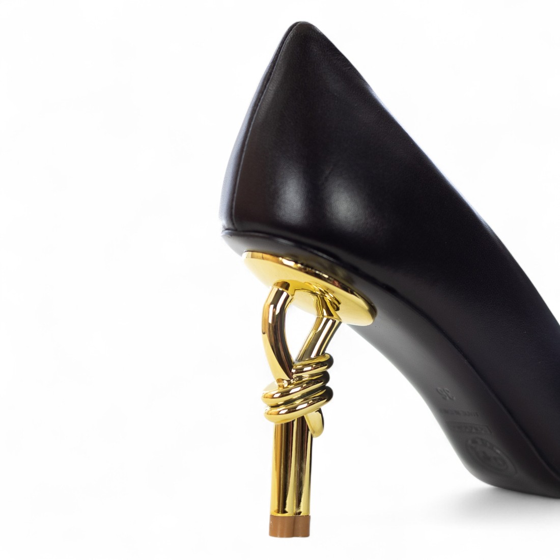 Black leather pumps G.P. Bologna are elegant and versatile, perfect for adding an original touch to your look. The 85 mm gold-colored heel lends refined elegance, while the leather lining and insole ensure comfort and quality. The rubber bottom ensures stability and practicality in every occasion.