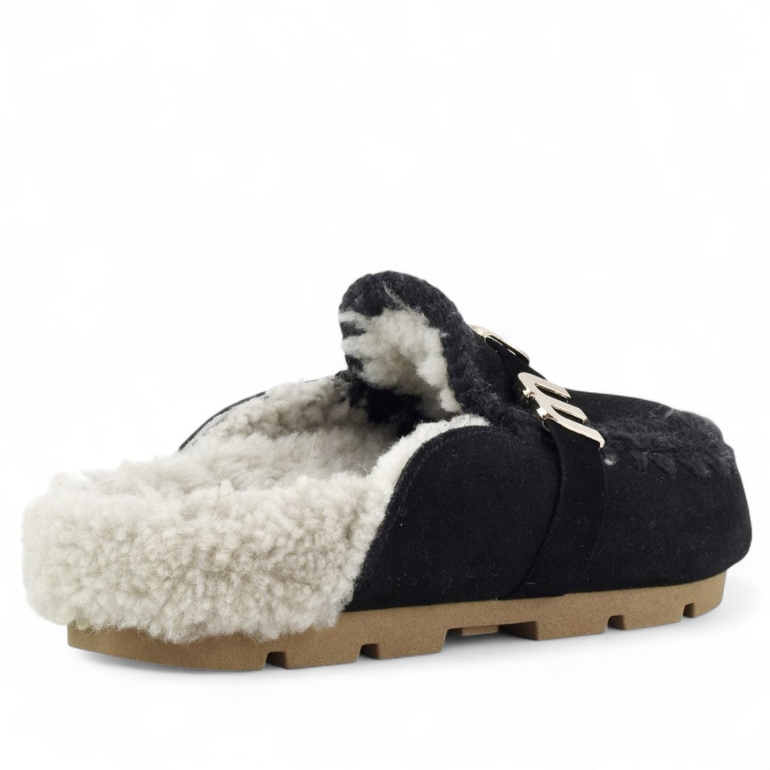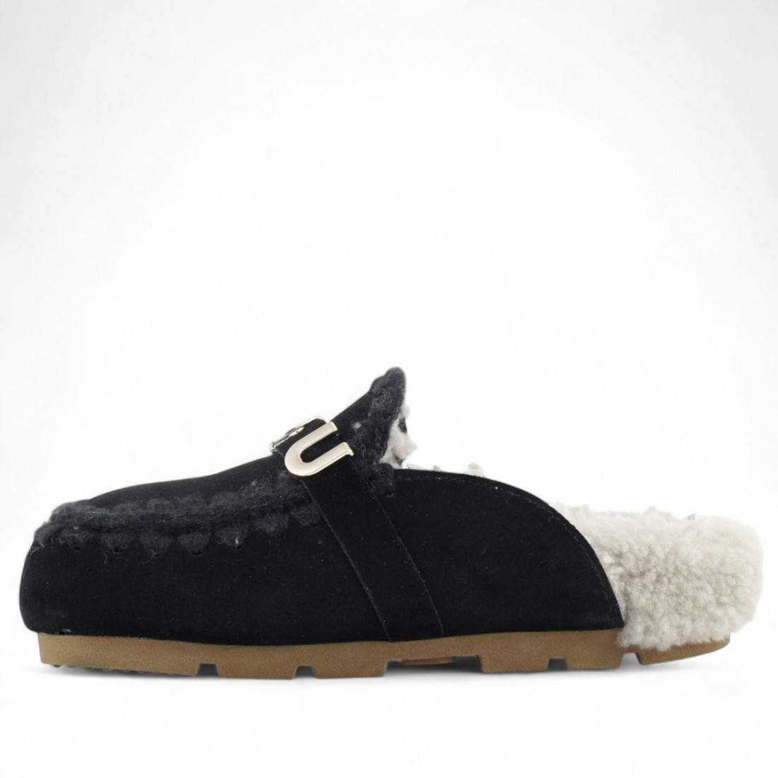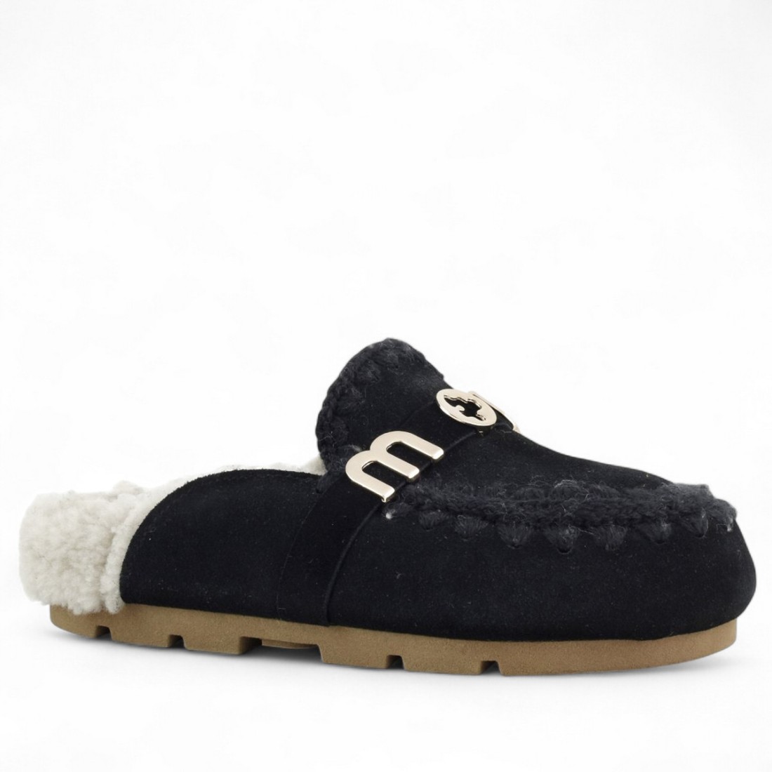 Discover MOU Winter Bio Slide Logo sabots in black suede with crochet stitching and soft double-face sheepskin lining. The metal logo on the upper and rubber sole ensure comfort and authentic style for a refined, natural look perfect for any season.Our customer service is available Monday through Saturday from 10:00 AM to 7:30 PM
