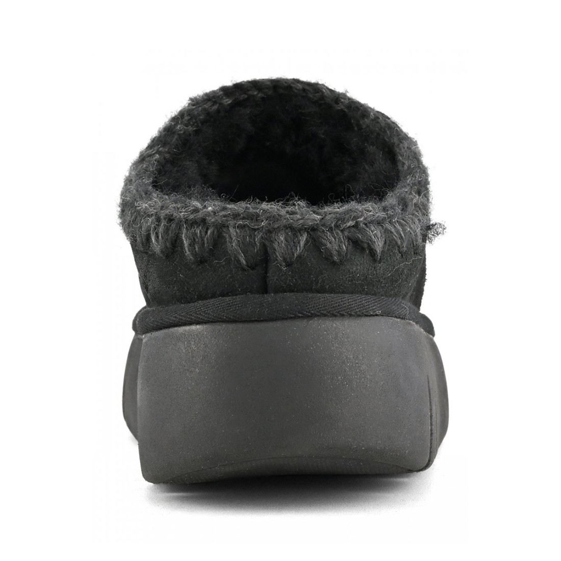 MOU Bounce Clog Metal Logo sabot in black suede with handmade crochet stitching. The interior is lined with soft double-sided sheepskin that provides warmth and comfort. The upper features the MOU metal logo, and the rubber sole provides stability and durability. Ideal for casual and sophisticated looks in any season.
