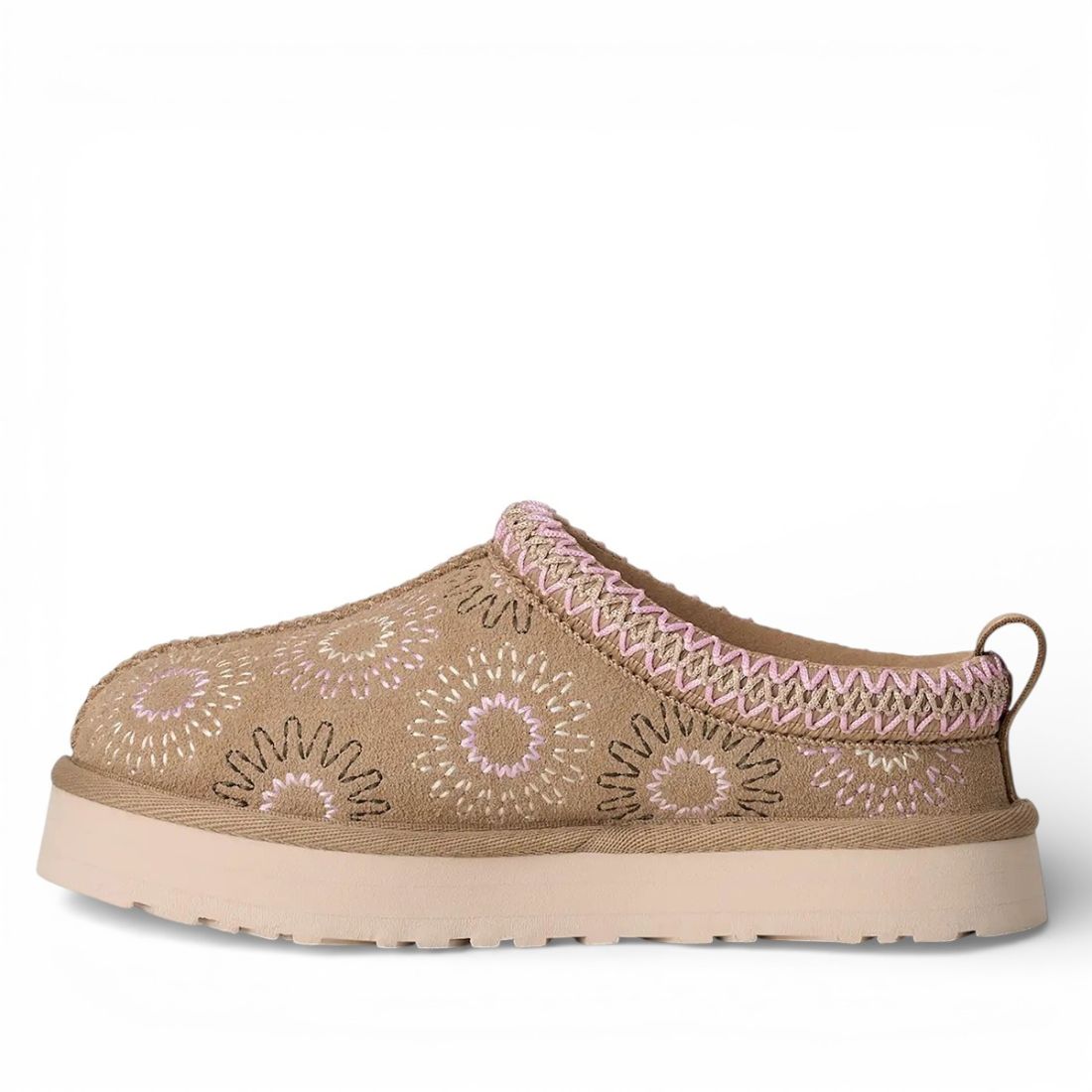 UGG's Tazz Sun Stitch sabot is a bundle of style and comfort for little ones. Made of soft mustard seed-colored suede, it features all over sun logo embroidery. The warm regenerated UGGplush™ lining and insole wrap the foot, while the lightweight sugarcane EVA outsole ensures comfort with every step. Easy to slip on, perfect for everyday wear.Our customer service is available Monday through Saturday from 10:00 AM to 7:30 PM