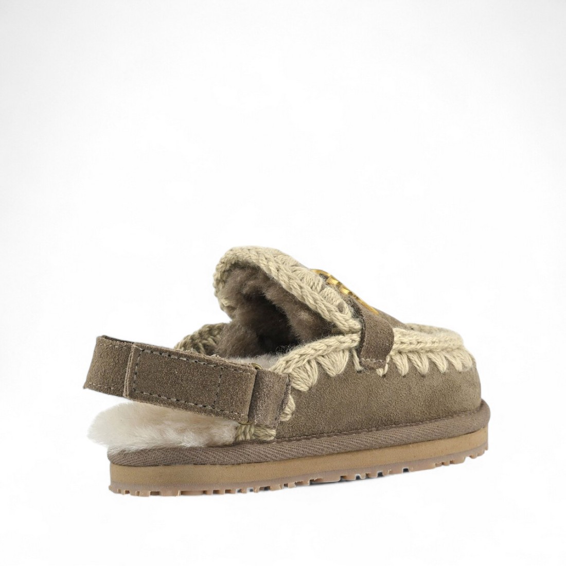 Discover the Mou Kids Slipper Back Strap sabots, handcrafted in soft elephant gray suede with a double-sided sheepskin interior. Finished with iconic wool stitching and metal logo, they offer comfort and authentic style. The rubber sole ensures practicality and durability, perfect for keeping feet warm and comfortable at all times.