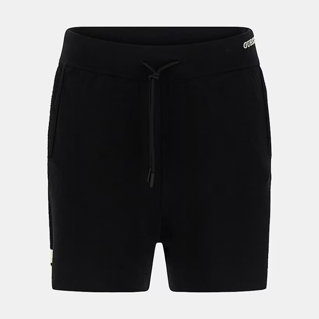 GUESS shorts made of lightweight fabric composed of 63% viscose and 37% polyamide, black color. They feature tone-on-tone elastic side band and embroidered logo at the waist. Elasticized drawstring waistband provides a comfortable fit, while side pockets add convenience. Regular fit, ideal for a casual and dynamic look on warmer days.