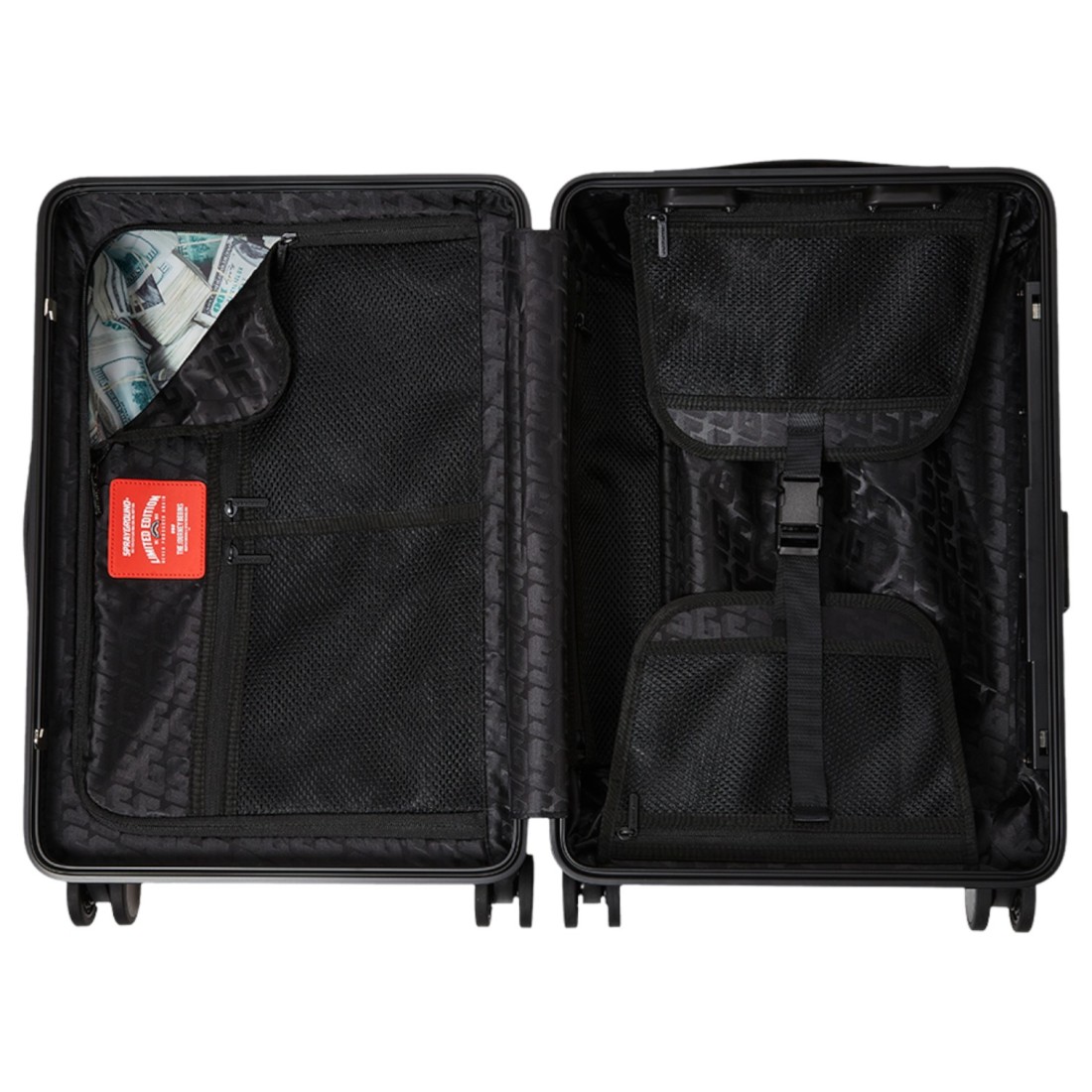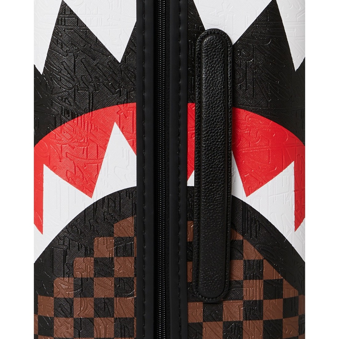 Trolley Sprayground Shark Checkered Carry-On: hard case with shark graphics and brown/black checkered print. Compact, lightweight and approved for carry-on luggage. Features 4 swivel wheels, telescoping handle and organized interior. Perfect for short trips with unmistakable street style.