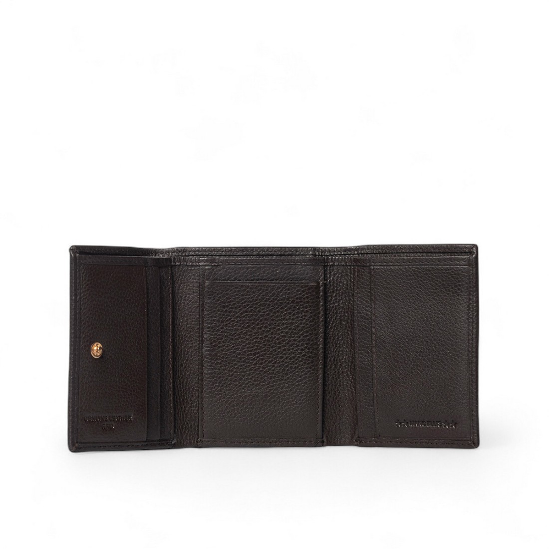 Elegant mini wallet Marc Ellis in cocoa-colored leather, embellished with a metal logo on the front. Compact and refined, it offers banknote compartment, card slots and zippered coin pocket on the back. Trifold design with snap button, ideal for those who love practicality and style without sacrificing a touch of class. Integrated RFID protection. Dimensions: 10.5x9x3 cm.