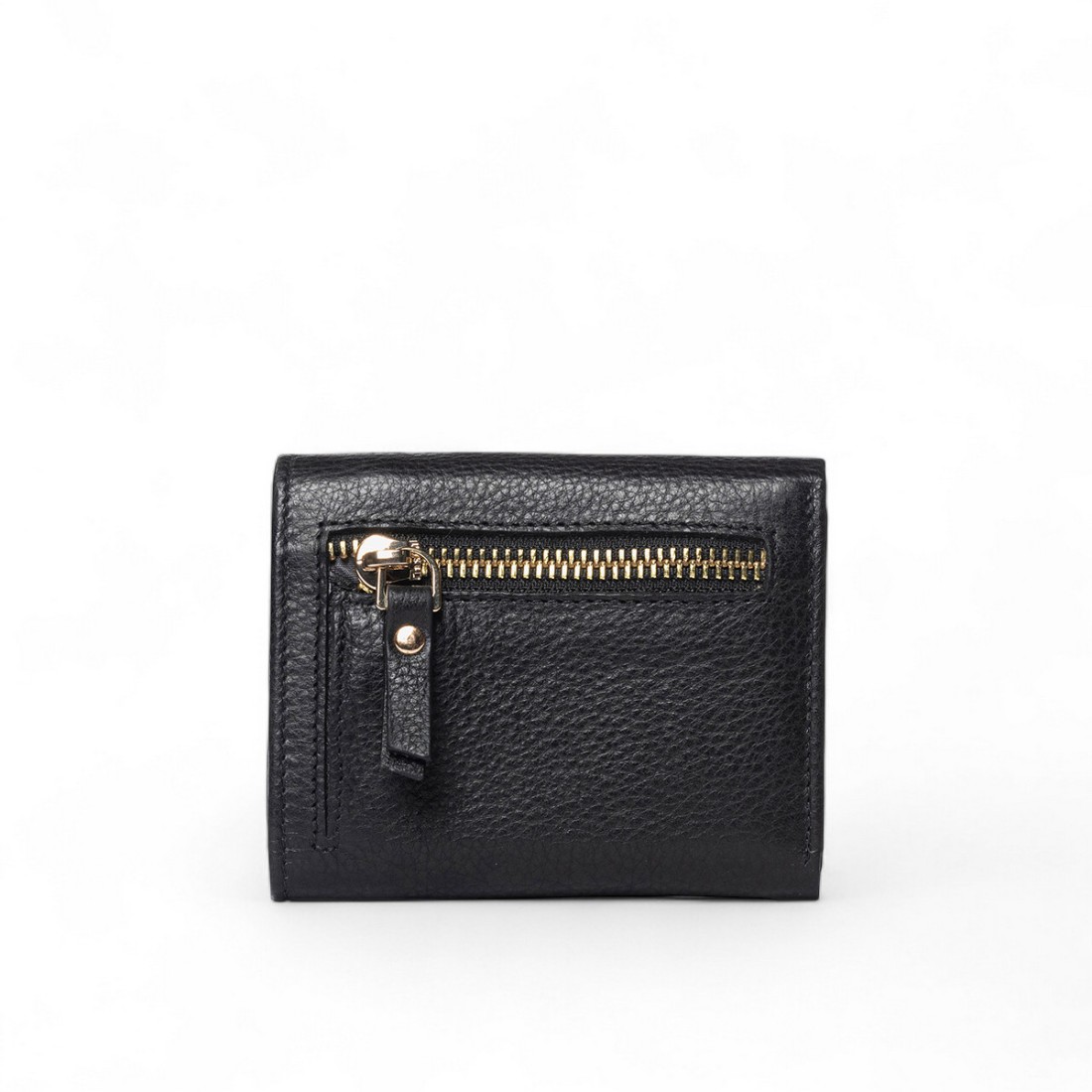 Elegant mini wallet Marc Ellis in black leather, embellished with a metal logo on the front. Compact and refined, it offers banknote compartment, card slot and zippered coin pocket on the back. Trifold design with snap button, ideal for those who love practicality and style without sacrificing a touch of class. Integrated RFID protection. Dimensions: 10.5x9x3 cm.Our customer service is available Monday through Saturday from 10:00 AM to 7:30 PM