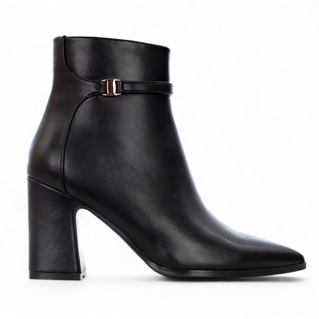 EXÉ's signature black faux leather ankle boot features a functional side zipper and ornamental buckle. The 85mm high heel offers elegance and momentum, while the rubber bottom ensures stability and comfort. Faux leather lining and insole for a soft fit, ideal for completing refined and fashionable looks.Our customer service is available Monday through Saturday from 10:00 AM to 7:30 PM