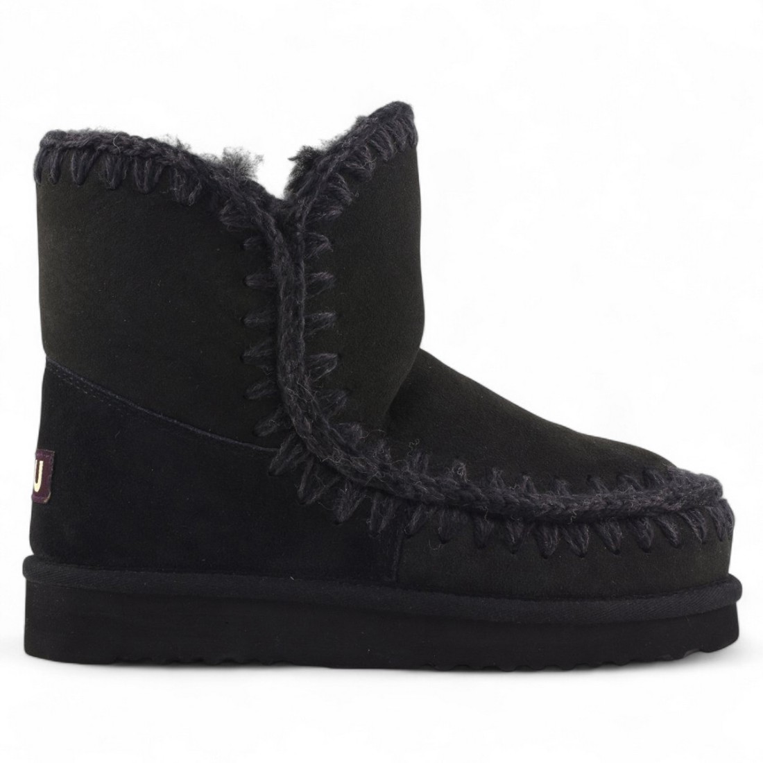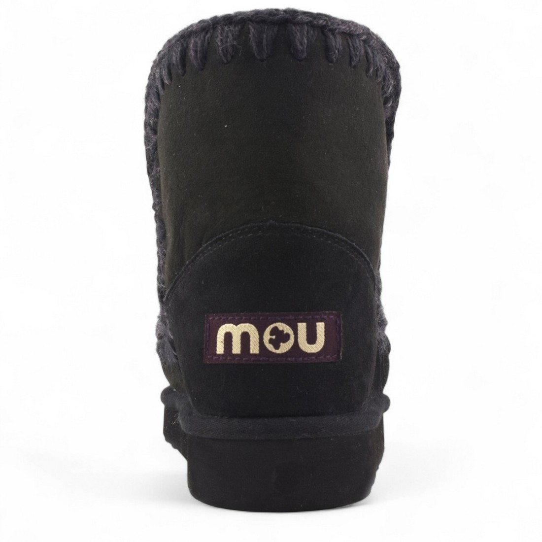 MOU Eskimo 18 black suede ankle boot, finished with handcrafted crochet stitching and soft double-face sheepskin lining for natural comfort. The Mou logo on the back and rubber sole ensure style and practicality, perfect for those looking for iconic and durable footwear ideal for the cold season.