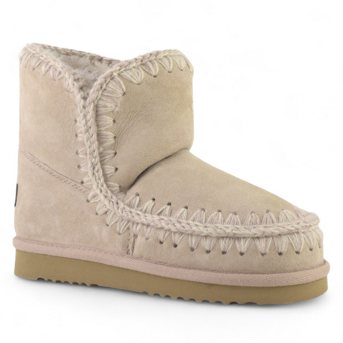 MOU ankle boot Eskimo 18 in pink suede with beige hues, finished with handcrafted crochet stitching and soft double-face sheepskin lining for natural comfort. The Mou logo on the back and rubber sole ensure style and practicality, perfect for those looking for iconic and durable footwear ideal for the cold season.