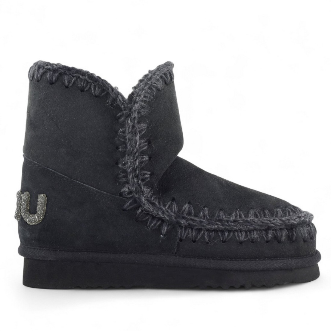 MOU Eskimo 18 Glitter Logo black suede ankle boot with crochet stitching, warm double-face sheepskin lining and Mou glitter logo stitched on the heel. Lightweight, comfortable and iconic design is ideal for completing casual and sophisticated looks. Durable rubber sole for the perfect balance of style and comfort.