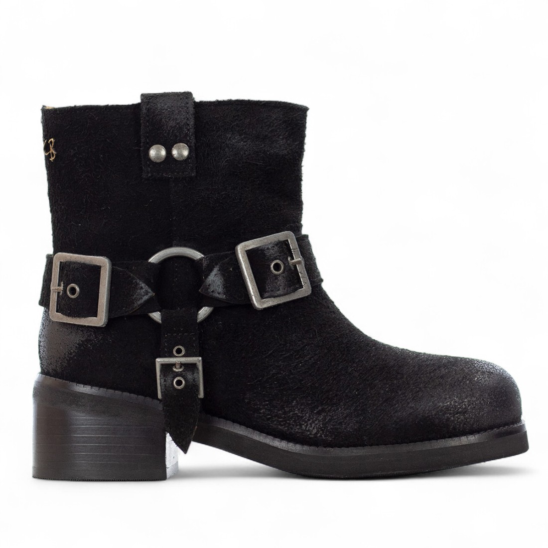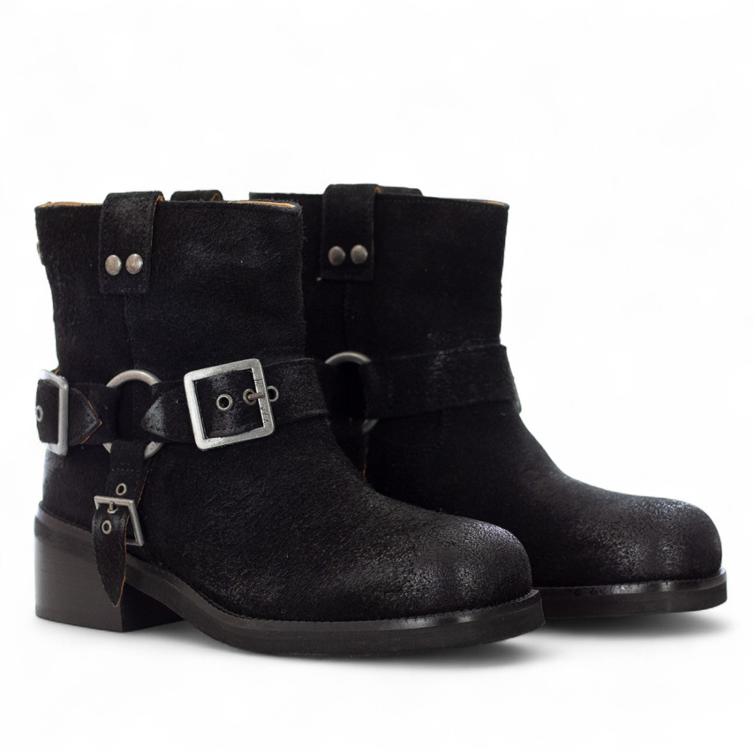 Coral Blue vintage-effect black soft suede ankle boot with 55 mm heel and side straps. Leather lining and insole for maximum comfort and breathability. The rubber bottom provides stability, making it ideal to complete a chic and sophisticated look for any occasion.