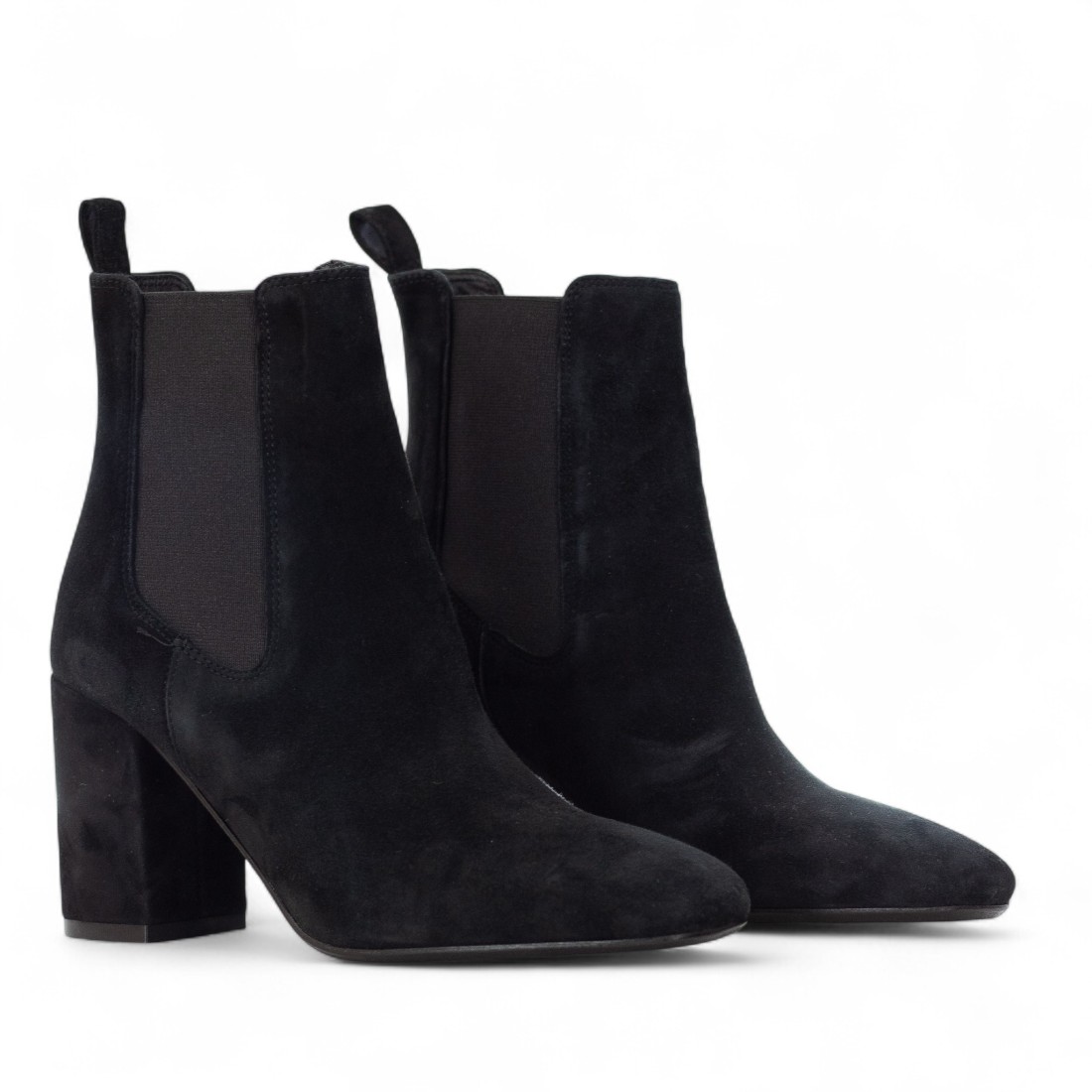 The CARMENS PADOVA ankle boot, made of soft black suede leather, combines elegance and comfort. The leather and fabric lining ensures a pleasant fit, while the rubber bottom provides stability. The elasticized side detail adds a modern touch. With an 85 mm heel, it is the ideal choice for a refined and comfortable look, perfect for both work and leisure.Our customer service is available Monday through Saturday from 10:00 AM to 7:30 PM