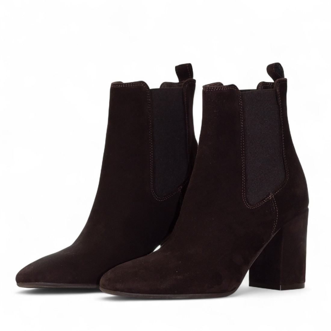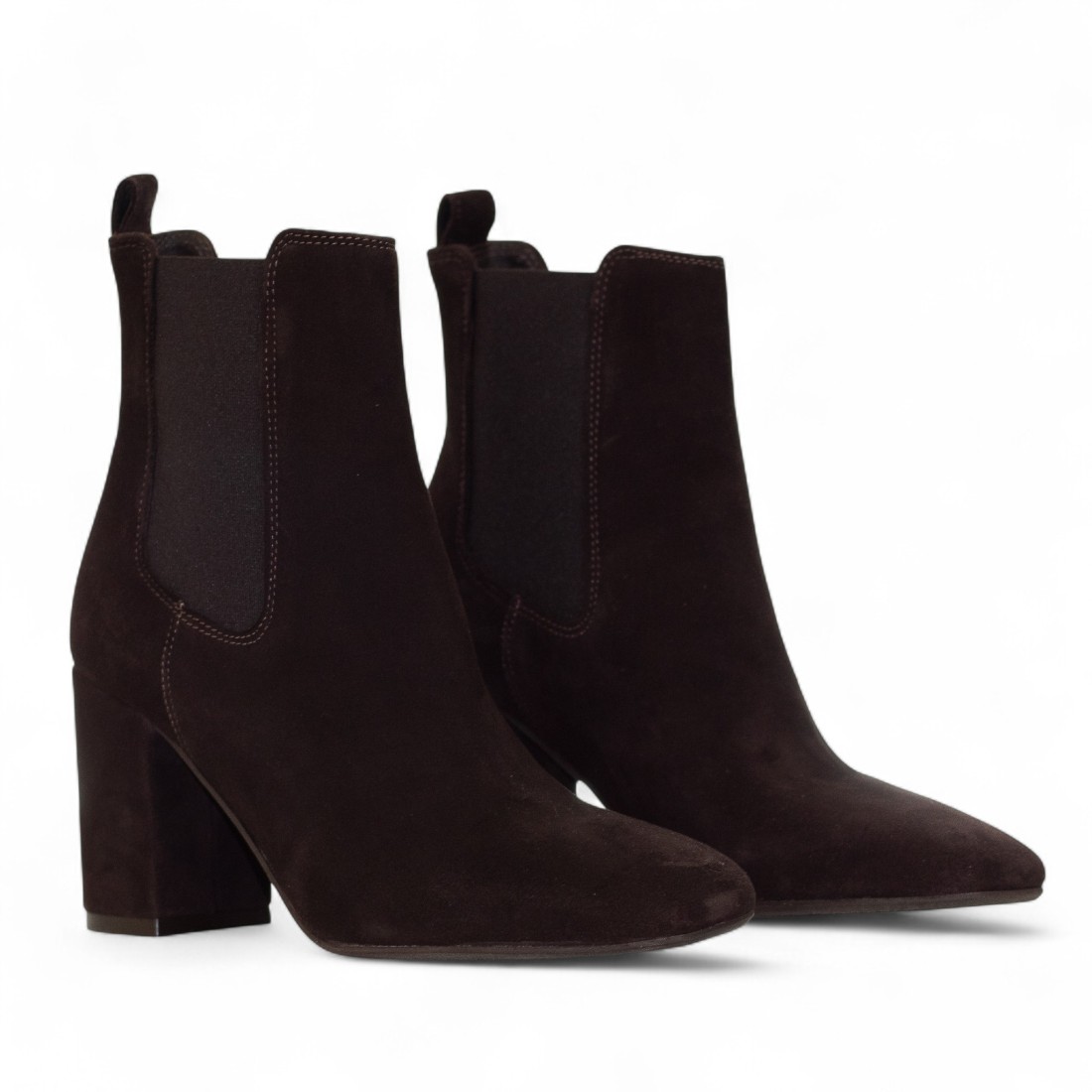 The CARMENS PADOVA ankle boot in soft brown suede combines elegance and comfort. The leather and fabric lining ensures a pleasant fit, while the rubber bottom provides stability. The elasticized side detail adds a modern touch. With an 85 mm heel, it is the ideal choice for a refined and comfortable look, perfect for both work and leisure.Our customer service is available Monday through Saturday from 10:00 AM to 7:30 PM