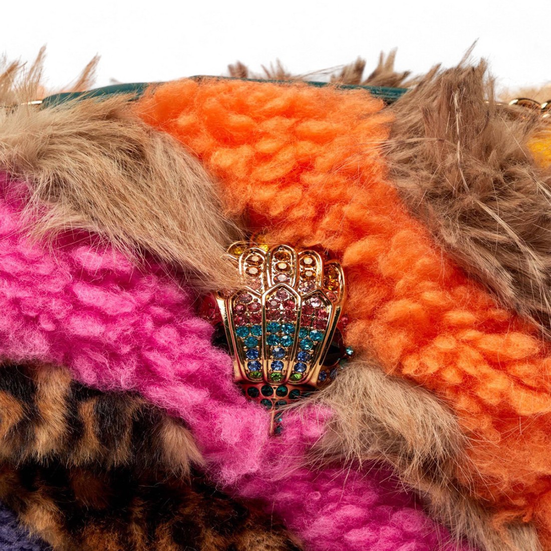 XXL Kensington Fur multicolored faux fur shoulder bag with patterned details, embellished with the iconic rhinestone eagle head. Featuring a chain shoulder strap, double internal compartment and practical flap closure, it combines style and functionality. Size 37x25x15 cm, ideal for those looking for an original and capacious accessory to complete every look with a sophisticated touch.