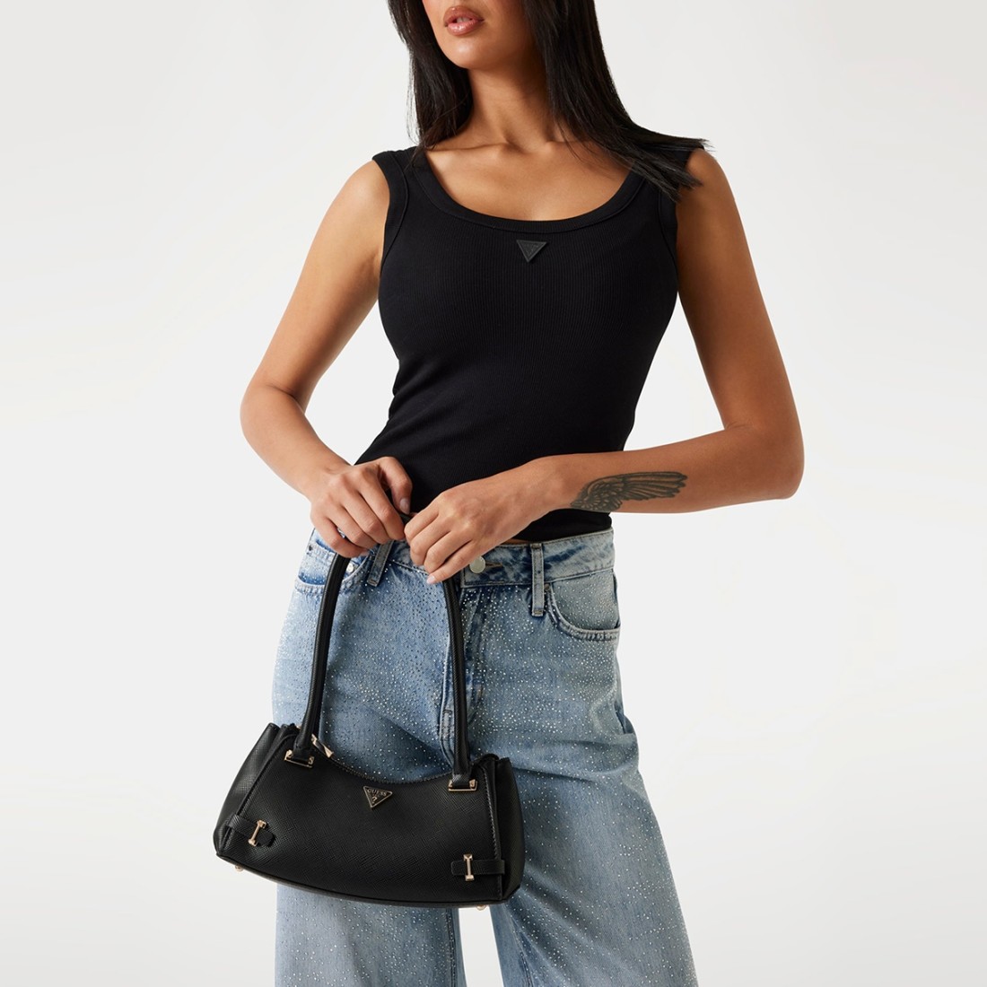 Discover the GUESS Rosalba faux leather shoulder bag with refined saffiano processing. Elegant and practical, it features zipper closure, silver-colored metalwork and iconic metal logo triangle on the front. Size 28x15x11 cm, perfect to complete your every day look with style.